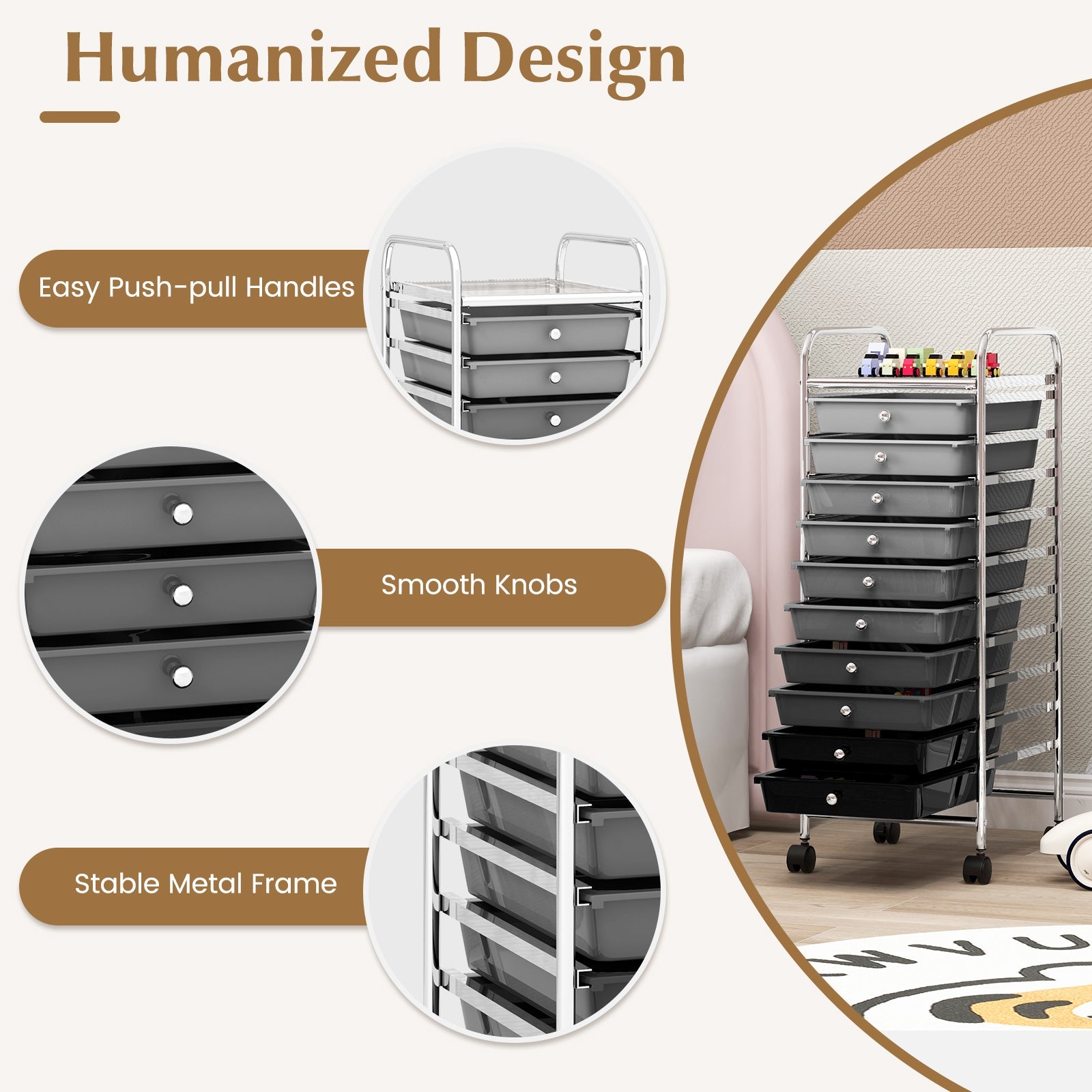 - Box Qty: 1(May vary by batch)Package include: 1 x 10-drawer mobile storage trolley 1 x instructions manual