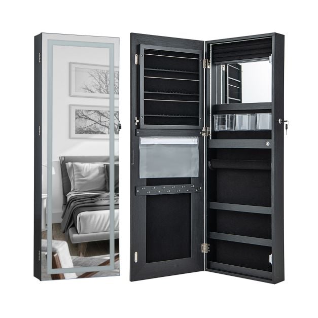 Colour: Black/ White Material: MDF + Glass+PVC Opening Angle: 110° Product Dimension (Without Hooks): 37 x 10.5 x 108 cm (L x W x H) Hook Dimension: 32.5 x 5 cm (L x W) Interior Mirror Dimension: 34.5 x 18.5 cm (L x W) Cable Length of Adapter: 1.5 m Net Weight: 12kg Package includes: 1 xJewelry Armoire 2xDoor Hooks 2xExpansion Screws 1 xAdhesive Tape 2xAnti-Scratch Protectors 1 xAdapter 1 x Instruction Manual