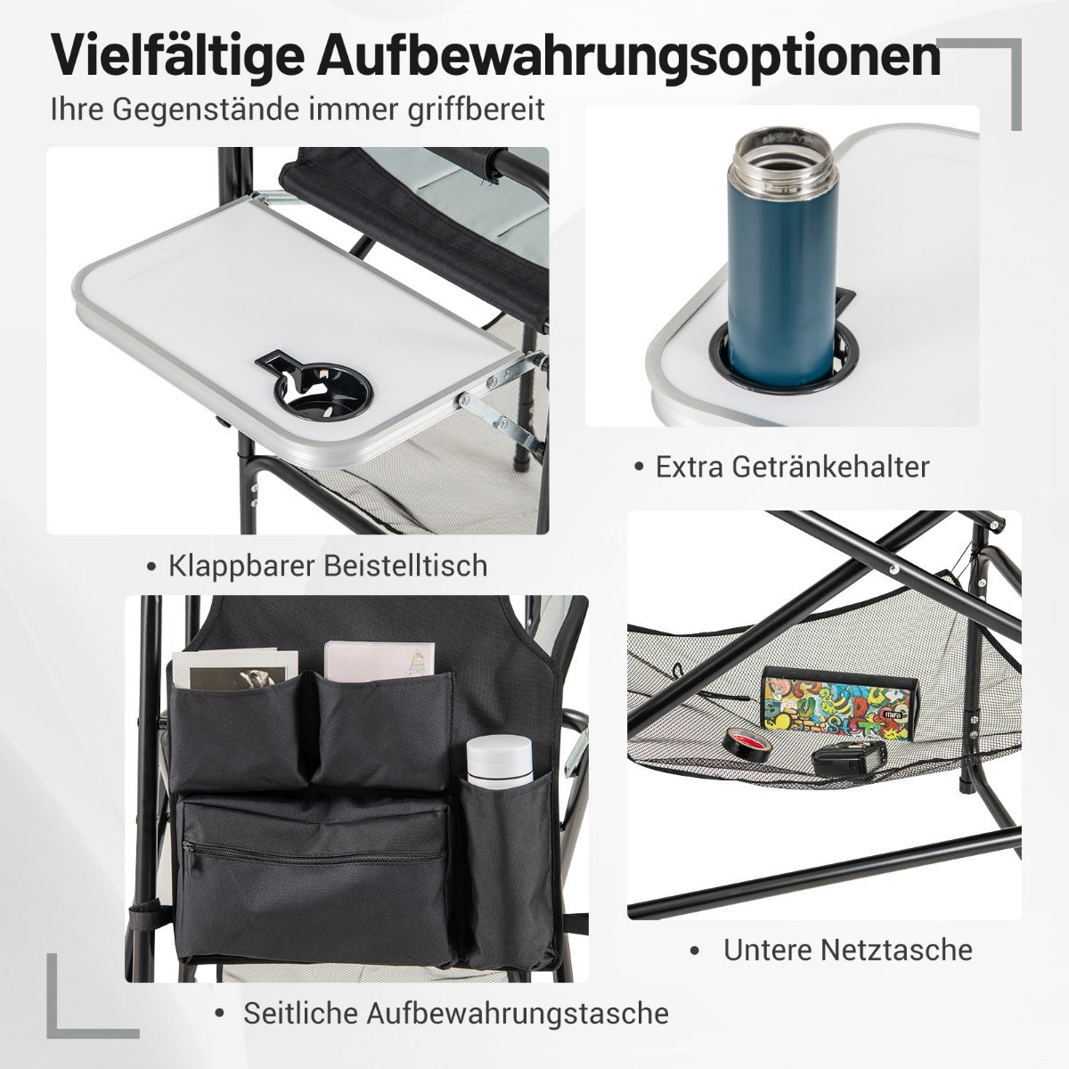 This 116.5 cm tall directors chair with foldable side table and footrest-grey is designed to keep your space organised while delivering reliable everyday functionality and a clean, modern look.