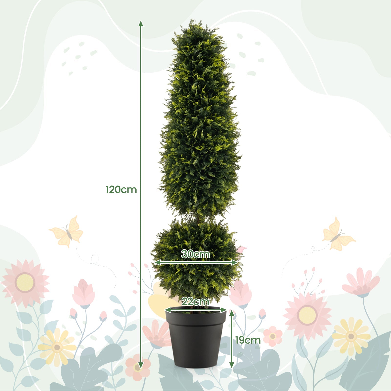 - Height: 120 cm Diameter of Topiary Ball: 30 cm Dimension of Flowerpot: 22 x 22 x 19 cm (L x W x H)