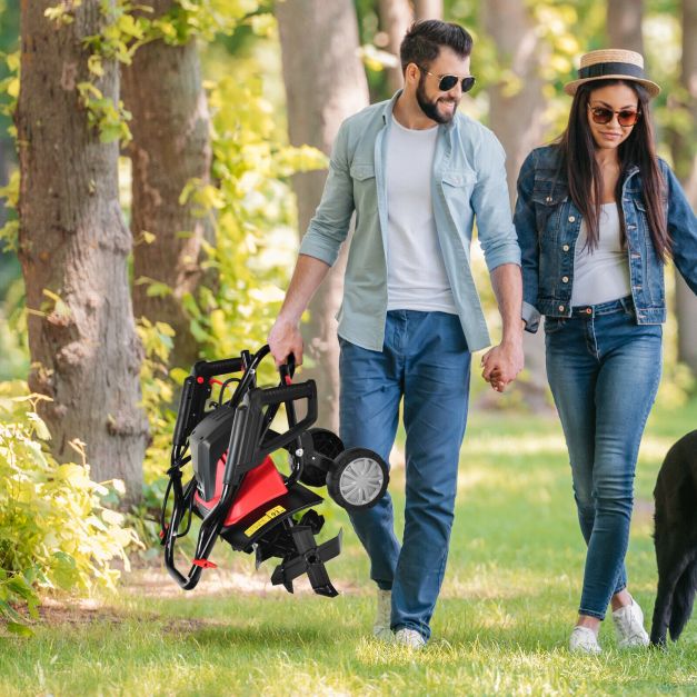 Are you still struggling with digging your garden? Our small cultivator is ideal for small to medium-sized gardens! The tiller cultivator features a powerful 13.5 amp motor and six tilling blades to quickly loosen the hard soil whilst giving reliable stability in use. The sharp tines of the blades help get into the ground, whilst also being durable. For safety, the machine is equipped with an on/off trigger and a Press Safety button which must be pressed and held first before trigger start will work. Don't struggle with manual spades and forks, get your own cultivator today! Enjoy your gardening work! Lightweight design with wheels for easy movement Safety double start switch Large shield to prevent small stones from flying and hurting people Ergonomic handles Perfect for cultivating a 43cm width and 22cm depth Powerful 13.5 amp motor Suitable for small to medium-sized vegetable gardens, orchards, etc Easy to operate