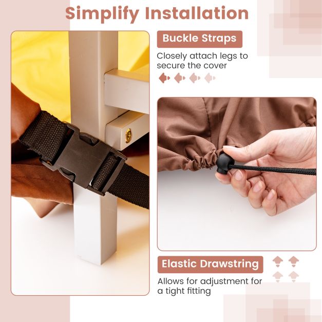 Introducing the versatile patio table cover! It is perfect for round table chair sets up to 158/181/213cmin diameter.Crafted from PU-coated polyester fabric, this table chair set cover is not only durable and tear-proof, but also built to withstand the harshest outdoor elements. Come rain, snow, sun, or wind, this all-weather table cover offers all-year-round protection against nature’s debris.Its intelligent design includes air vents for excellent circulation, preventing the cover from being lifted by strong winds. With buckle straps and adjustable drawstrings, installation is a breeze, ensuring a secure fit that won’t be blown away.Now say bye to your messypatio furniture, the outdoor furniture cover will be helpful to keep clean. But the coverage depends on the furniture dimension, especially the chair depth. Please measure the size of your furniture before purchasing. Flexible Fit for More Sizes: Sized at 158 x 70/181 x 70/213 x 70 cm(D x H), the patio furniture cover can match most round table chair set with a max diameter of 158/181/213 cm. But the coverage depends on the furniture dimension, especially the chair depth. Please measure the size of your furniture before purchasing. PU-Coated Polyester Fabric: The outdoor table cover boasts a PU coating, enabling it to withstand harsh outdoor conditions. Also, built with high-density polyester fabric and tight stitches, it becomes tear-proof and more durable. All-Weather Protection: The round table chair set cover aims to offer all-year-round protection against various debris. More, its PU coating promotes water resistance to keep your furniture well-protectedfrom sun, wind, snow and rain. Scientific Air Ventilation: For proper air circulation, the patio table cover cleverly has air vents, so your furniture will stay in a relatively dry space. On the other hand, ideal air ventilation is helpful to avoid wind lifting. Easy and Secure Installation: It comes with more great detailsto simplify installation. Its buckle straps and adjustable drawstrings will ensure a snug and secure fit, which can prevent the table cover with handles from being blown away by strong winds.