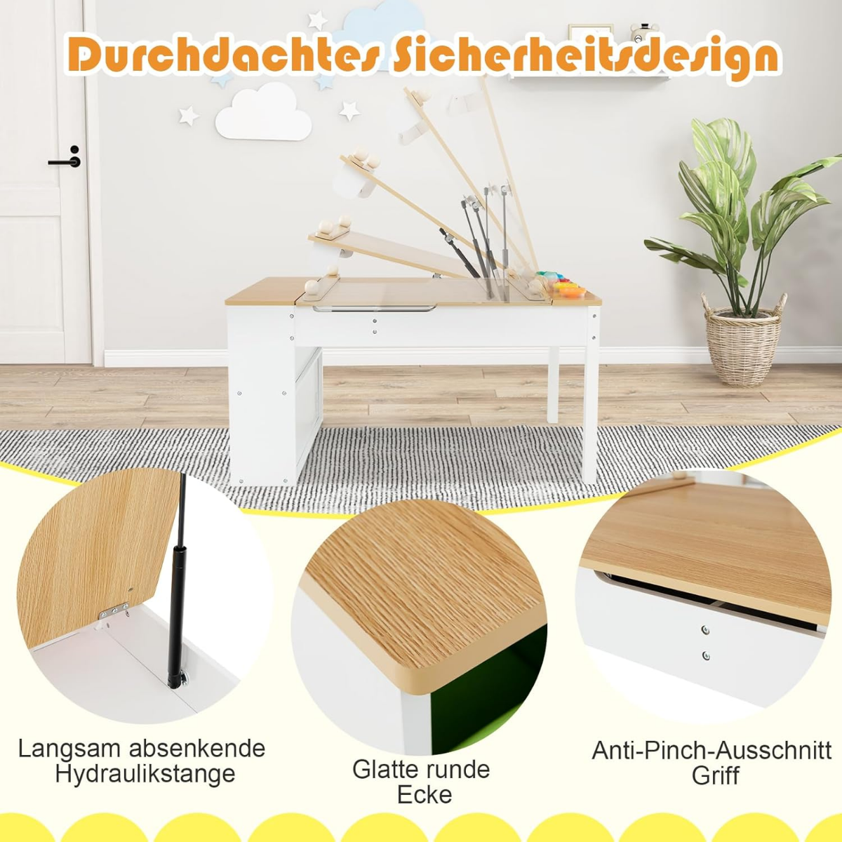 This unique2-in-1 kids art table and art easel sethas a liftable tabletop, which allows you to transform the table to a kids art easel. The tabletop is lifted by a durable hydraulic rod, which brings slow lowering for safety. The cutout handle also protects your little one from accidental injuries. This art station offers lots of storage options for various supplies, including spacious tabletop, hidden storage compartments under the tabletop, 6 removable fabric bins with handles on 2 shelves and 5 paint cups. Made of sturdy MDF, the table can hold up to 91kg, while the chairs can hold up to 50kg.This multifunctional kids activity table and chair set is suitable for various scenarios, such as play room, kids bedroom, kindergarten, daycare, etc. 2-in-1 Design: You can lift the tabletop to reveal a built-in easel and lower the easel to transform it back into a kidsactivity Thismulti-functional kids table and chair setis suitable forlearning, eating, playing and drawing, which is a great addition for playroom, kids bedroom, kindergarten, daycare, etc. Kids Art Table with Paper Roll Holder:The paper roll holder is placed on the back of the desktop (a 10mlongpaper roll included), which can cultivate children's interest in painting to stimulate imagination and creativity. Paper roll dispenserand pressing rodshelp children hold their drawing paper in place.Plus, 2 chairs are provided for parent-child interaction or for your child to draw with a friend. Large Storage Capacity and Rich Accessories:Hidden storage space under the spacious desktopcan be used to store books, painting tools, stationary and more. 2-tier open open side shelves accommodate 6 removable storage boxeswith handlesto organize other essentials. 5 paint cups with covesare provided for convenience. Safety Protection:This woodenkids activity table set is ASTM and CPSIAcertified to bring parents peace of mind. Thoughtful safety designof slow lowering hydraulic rodand cutout handle prevents your little one’s fingers from accidentally getting caught.Besides, smooth round corners prevent unexpected injuries. Kids-Friendly andWell-Made Details:The waterproof tabletopis effortless to clean with a damp cloth. The kid-sized chairs haveergonomic backreststo provide ample support for kids’spine, developing a good sitting posture. The assembly is easy with detailed instructions.