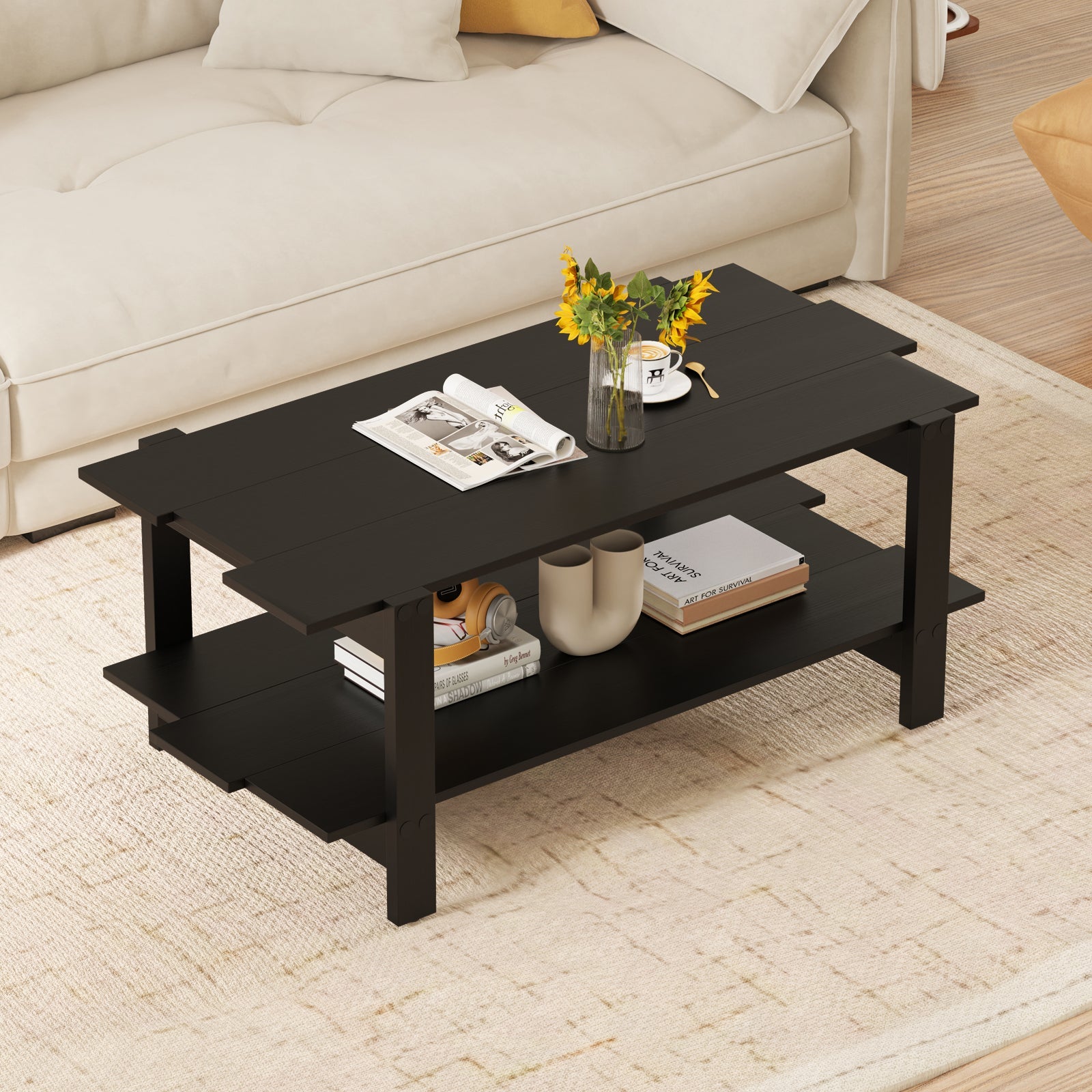 - 1 × 2-Tier Coffee Table Slatted Wood Center Table with Storage Shelf Accent Cocktail Table 120kg Capacity Black
