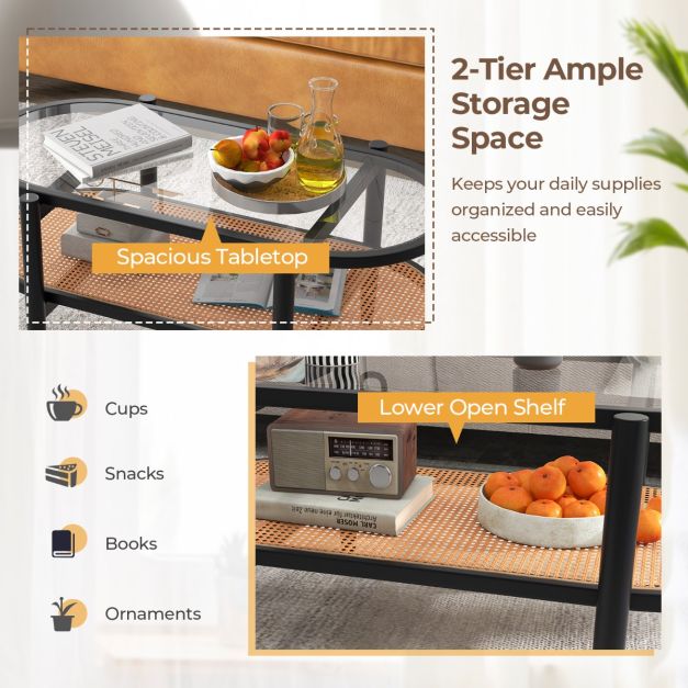 -Boasts a reliable acacia structure that is sturdy, durable and natural-Fitted with anti-slip foot pads to avoid scratching the floor-Features 2 kinds of shelves to provide adequate storage space-Made of tempered glass, which is long-lasting, heatproof and easy to clean-Consists of PE rattan to resist fading, tear and unpleasant smells-Elevated design to gain roomy bottom clearance for easy sweeping-Versatile application in the living room, reception room or office-Hassle-free installation to save a lot of time and effort