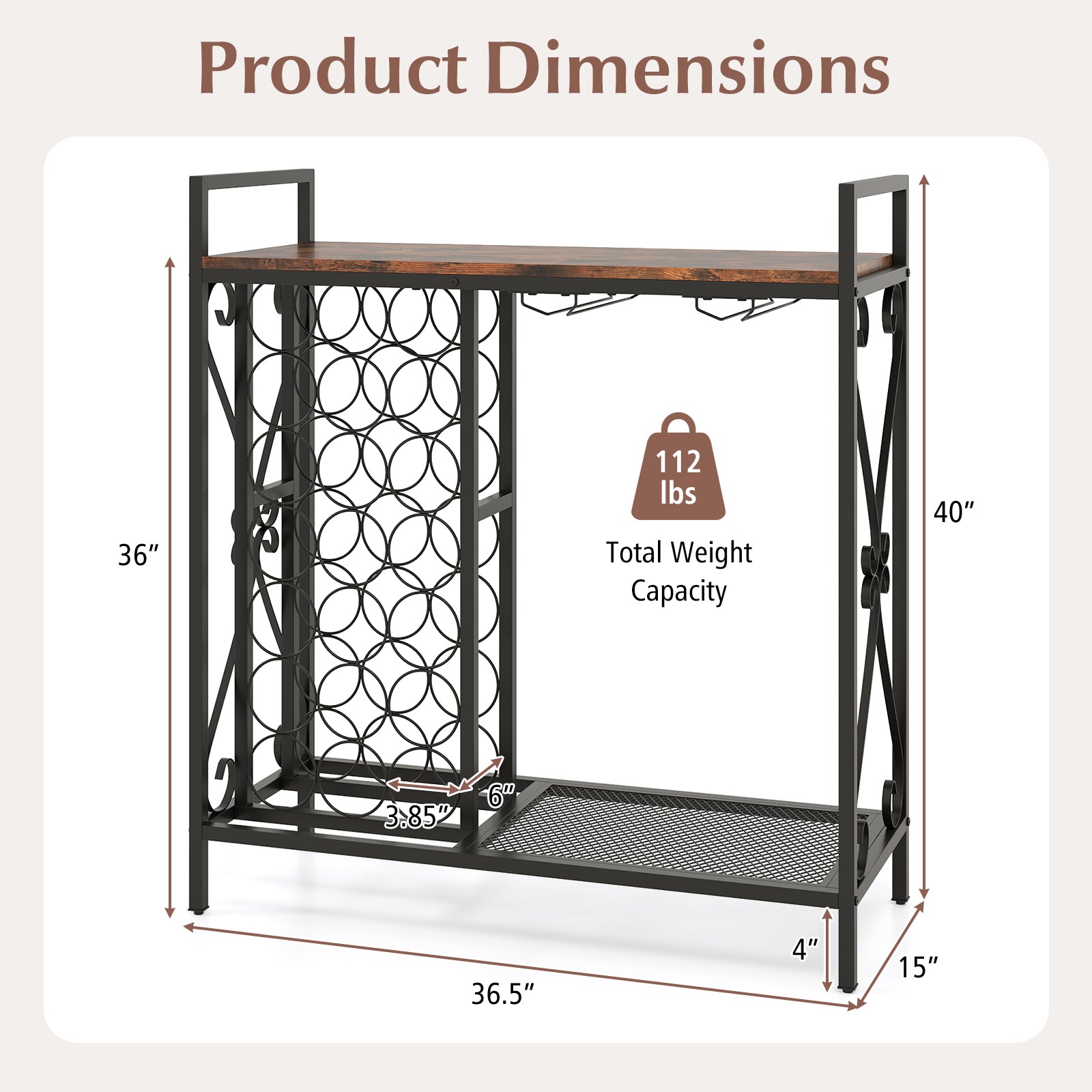 - Color Rustic Brown/Black Material Metal, Engineered Wood Overall Dimension 36.5" x 15" x 40" Size of Each Bottle Holder 3.85" x 6" Weight Capacity of Countertop 44 lbs Weight Capacity of Mesh Metal Shelf 22 lbs Weight Capacity of Each Bottle Holder 2.2 lbs Total Weight Capacity 112 lbs Net Weight 31 lbs Box QTY 1 Box Qty 1(May vary by batch)