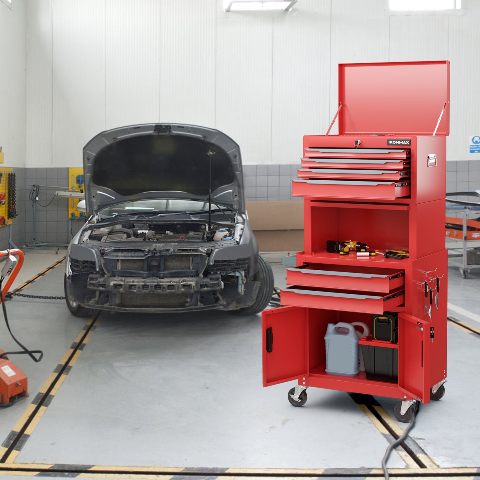 - Color Black/RedMaterial MetalOverall Dimension 28" x 13" x 53"Dimension of Upper Chest 23.5" x 10.5" x 13.5"Dimension of Middle Cabinet 23.5" x 10.5" x 9.5"Dimension of Bottom Cabinet 28" x13" x 30"Total Weight Capacity 330 lbsWeight Capacity of Each Upper Drawer 22 lbsWeight Capacity of Each Lower Drawer 44 lbsWeight Capacity of Top Compartment 22 lbsWeight Capacity of Bottom Cabinet 66 lbsWeight Capacity of Middle Storage Compartment 99 lbsNet Weight 66 lbs