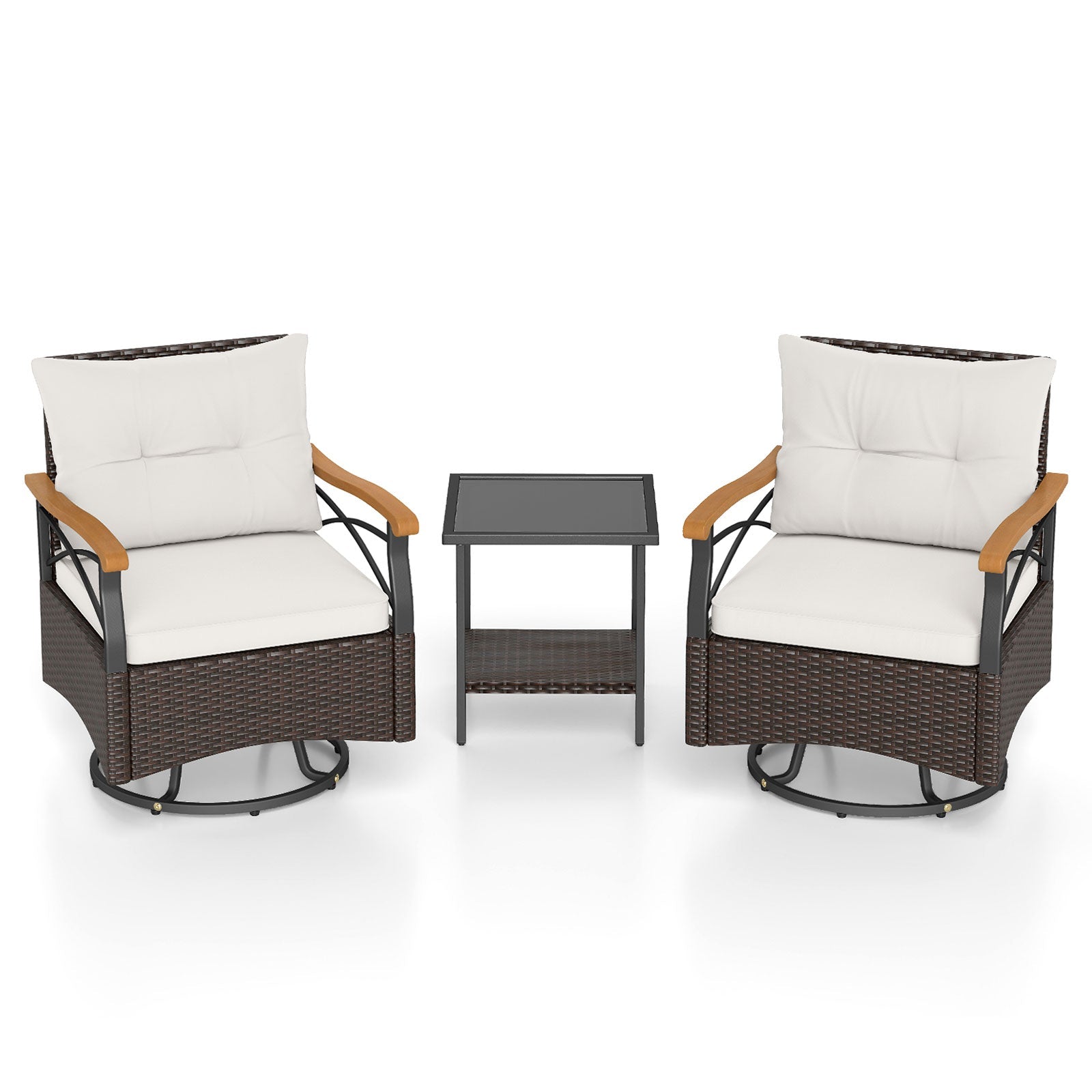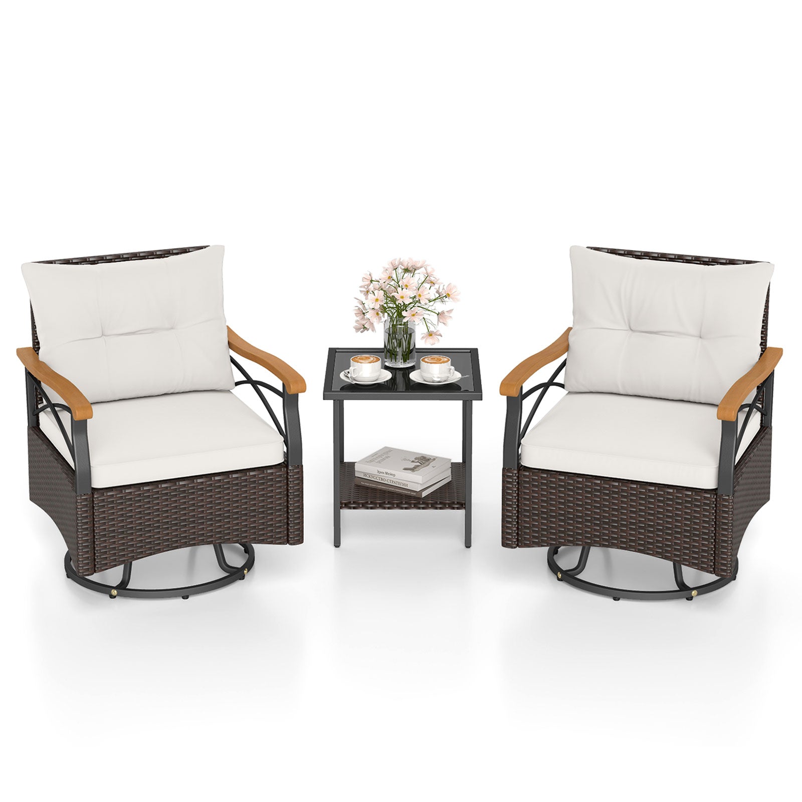 3 Piece Outdoor Swivel Chair Set Patio Wicker Rotating Chairs with Table-White