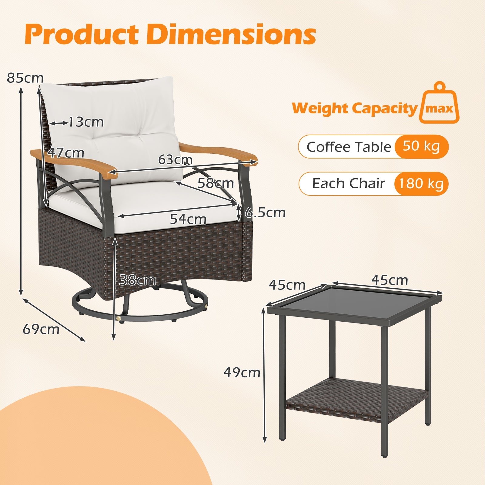 - Material: PE Rattan, Metal, Sponge, Polyester, Tempered Glass, Acacia Wood Dimension of Chair: 69 x 63 x 85 cm (L x W x H) Dimension of Seat Cushion: 58 x 54 x 6.5 cm (L x W x Thickness) Dimension of Back Cushion: 58 x 47 x 13 cm (L x W x Thickness) Dimension of Coffee Table: 45 x 45 x 49 cm (L x W x H) Seat Height from the Ground: 38 cm Weight Capacity of Coffee Table: 50 kg Weight Capacity of Each Chair: 180 kg