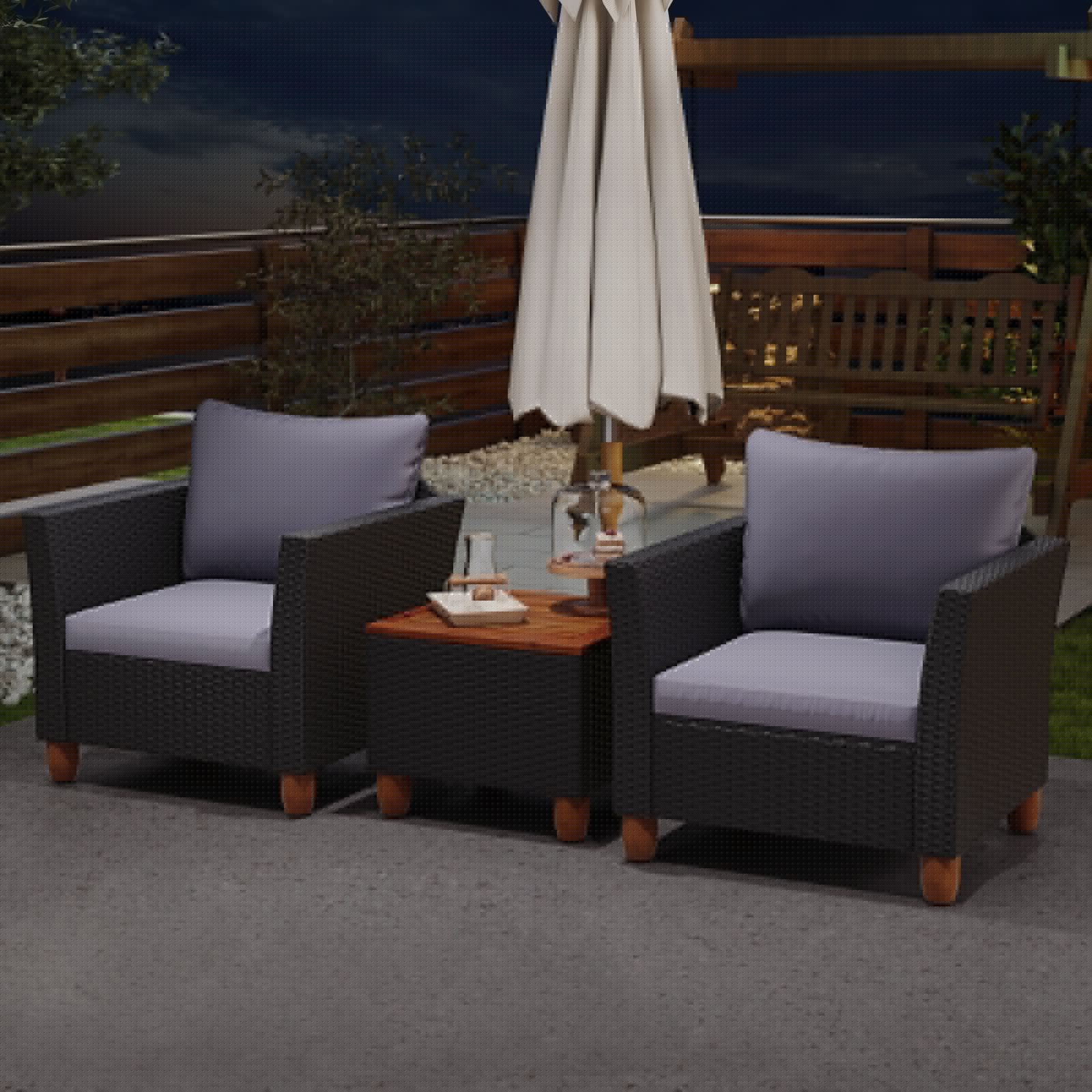 This outdoor conversation set includes 1 coffee table and 2 armchairs that exactly match the space of limited places, so you can place it on the porch or other small places. And the soft padded cushion can’t wait to tell you how comfortable they are. What’s more, the coffee table also can be used as a storage box to offer more storage space in limited places. After days and nights on the porch, this 3-piece outdoor bistro set will still be durable and stable thanks to its colorfast hand-woven PE wicker, rustproof metal frame and solid acacia wood. Premium Material and Sturdy ConstructionThis patio porch furniture will accompany you for a long time thanks to its selected materials. The hand-woven black PE wicker takes the advantage of being colorfast and sun-protective. The X-shaped structure boasts the ability to be stable. And the acacia wood makes it sturdyto use. Meanwhile, the adjustable foot pads make it stable on uneven ground. Better Comfort with Cushions:It's all thanks to the soft padded cushions with the high-density sponge that provides you with a comfy sitting experience. And the cushions are zippered for easy cleaning. Note: 1) Please always keep cushions dry to prolong the service time. 2) Please note that color differences may occur between different lights and monitors. Multi-functional Side Table:In addition to using the table as a side table to accommodate different items, it also serves as a storage box that creates sufficient storage space. And the premium pneumatic rod allows you to open effortlessly and close safely. Wide Applications:Your outdoor leisure time will start with this 3-piece outdoor conversation set. It includes 1 coffee table and 2 ergonomic armchairs, which create a cozy for you and your beloved one. And it is perfect for limited places, such as porch, patio, garden and poolside, etc. Simple Installation: With all necessary accessories and a clear instruction, this 3 Pieces Patio Porch Furniture Setis easy to assemble.Please refer to the size instructions before purchasing to avoid unnecessary trouble. Please do not tighten all the screws until all the holes are aligned.