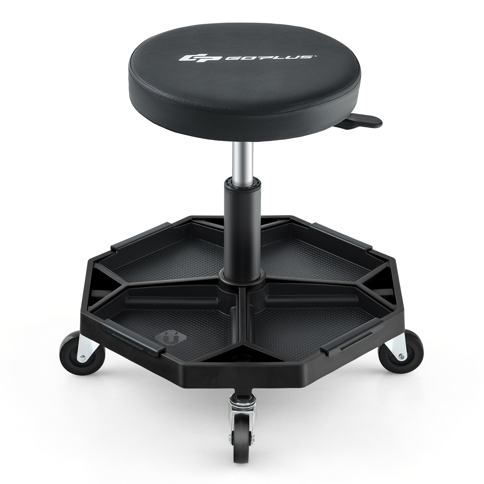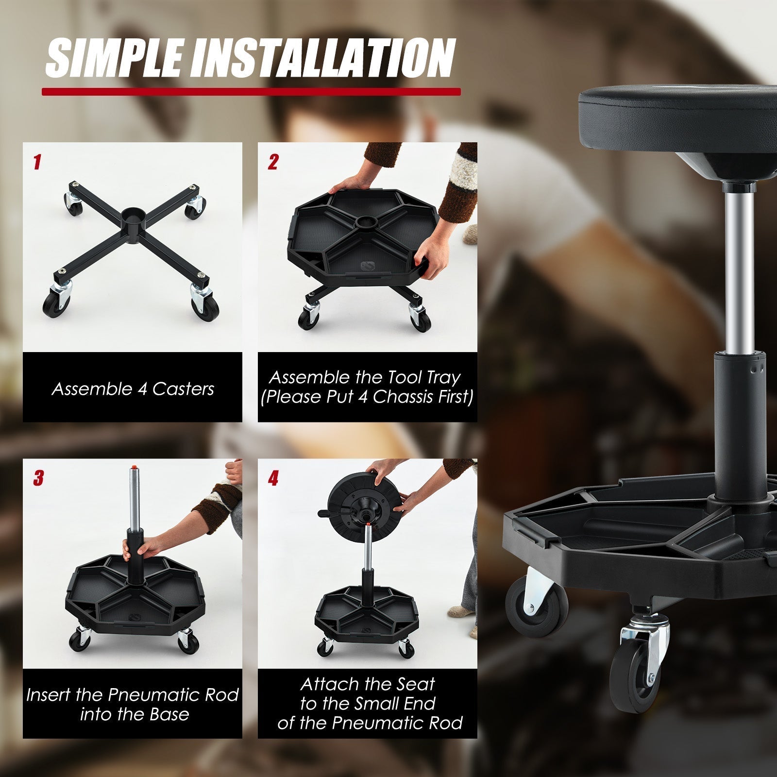 -Adjust the roller chair from 16 inches to 22 inches for different needs-SGS certified pneumatic rod for smooth adjustment-Move wherever you want with 4 universal casters-360° rotatable seat for additional convenience-Get maximum comfort when sitting on the soft padded seat-Premium faux leather is waterproof and oil-proof for easy maintenance-Convenient to fetch the needed tools thanks to its large tool tray-Make tools closer with 4 removable chassis-Put small tools in the magnetic quarter chassis for better storage-Sturdy metal frame for 330 lbs stronger bearing capacity-Simple installation required