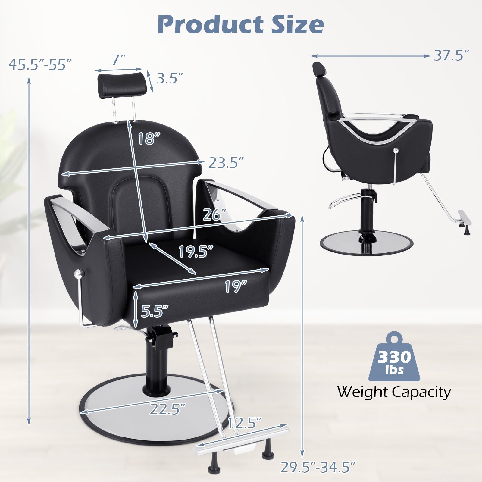 Color Black/Pink Material Metal, PVC Leather, Sponge Product Size 26" x 37.5" x 45.5"-55" Seat Size 19" x 19.5" Backrest Size 23.5" x 18" Headrest Size 7" x 3.5" Length of Armrests 26" Seat Height 29.5"-34.5 Thickness of Seat Cushion 5.5" Length of Footrest 12.5" Diameter of Metal Base 22.5" Weight Capacity 330 lbs Net Weight 66.5 lbs