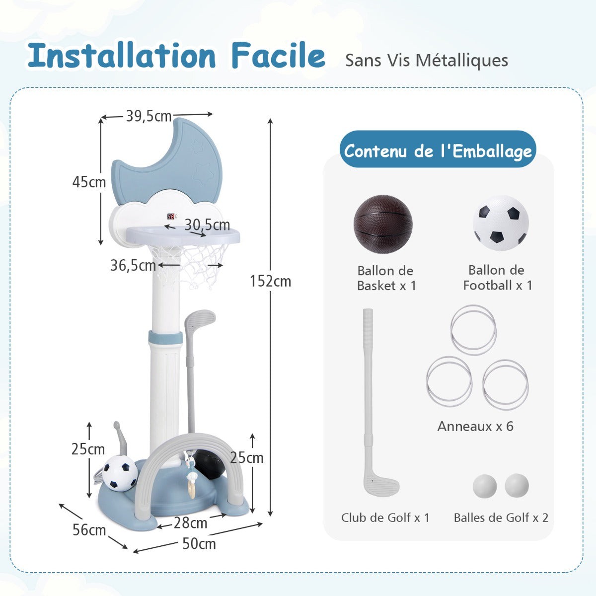 Colour: White+Blue/White+Yellow Material: HDPE+PP Item weight: 3.5 kg Overall Dimension: 56 x 50 x 114-152 cm (L x W x H) Basketball Dimension: 12 cm Football Dimension: 12 cm Golf Club Dimension: 12 x 60 cm (L x H) Golf Ball Diameter: 6 cm Ferrule ring Diameter: 14 cm Package Includes: 1 X Basketball Hoop 1 X Basketball 1 X Football 6 X Ring 1 X Golf Club 2 X Golf Ball 1 X Instruction Manual 1 X Bell Pendant