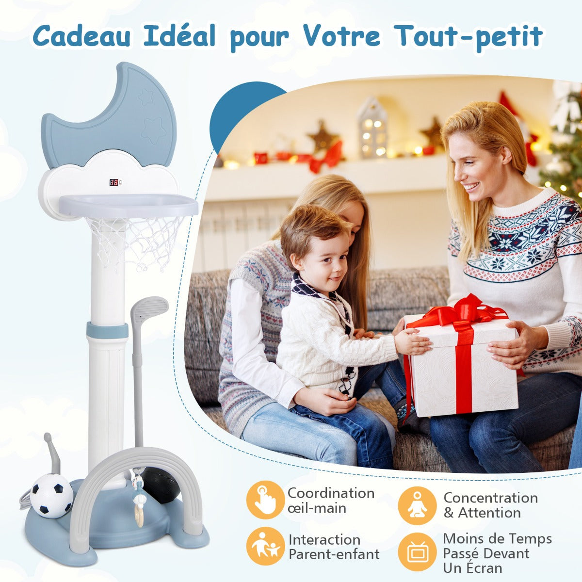 This adjustable basketball hoop is a versatile activity set that encourages children to grow while having fun, with height-adjustable features that can accompany them throughout their childhood. Moreover, equipped with a moon-shaped electronic scoreboard for real-time feedback, this set also features a sturdy construction with high-quality materials for indoor and outdoor play. Plus, this makes it a perfect gift choice for special occasions, promoting parent-child bonding and fostering relationships through exciting games and activities. 4-In-1 Multifunctional Sports Center: This amazing sports center combines basketball, ring toss, mini golf, and football into one, providing kids with a variety of play options for hours of fun. Encourage your child to stay active and improve their concentration, balance, strength, motor skills, and hand-eye coordination to grow healthier. Stable Construction and High-Quality Material: Constructed from premium HDPE and PP materials, this basketball hoop is built to withstand both indoor and outdoor play. Moreover, the large base structure enhances overall stability and reduces the risk of falling over. Moon-shaped Electronic Scoreboard: Featuring an electronic counter with infrared sensing, this mini basketball hoop can automatically displays shooting scores, providing real-time feedback and motivation for your kids. Furthermore, the cheering goal sound adds a touch of excitement to the game. Note: The scoreboard requires 3 AAA batteries (not included). 9-Position Height Adjustment: With 9 different heights from the basketball hoop to the floor ranging from 76 cm to 114 cm, the gymnastics bar can be easily modified with height fixing clip to accommodate users of different ages. In addition, this versatile feature ensures that you can always find the perfect height for your children, making it a long-lasting companion throughout their childhood. Perfect Gift Choice: This fun basketball gaming set would makes an excellent gift for special occasions such as birthdays, Christmas and Children's day. Furthermore, it not only provides fun games, but also promotes parent-child bonding and fosters strong relationships through weekend activities, friend gatherings, group events, and games.
