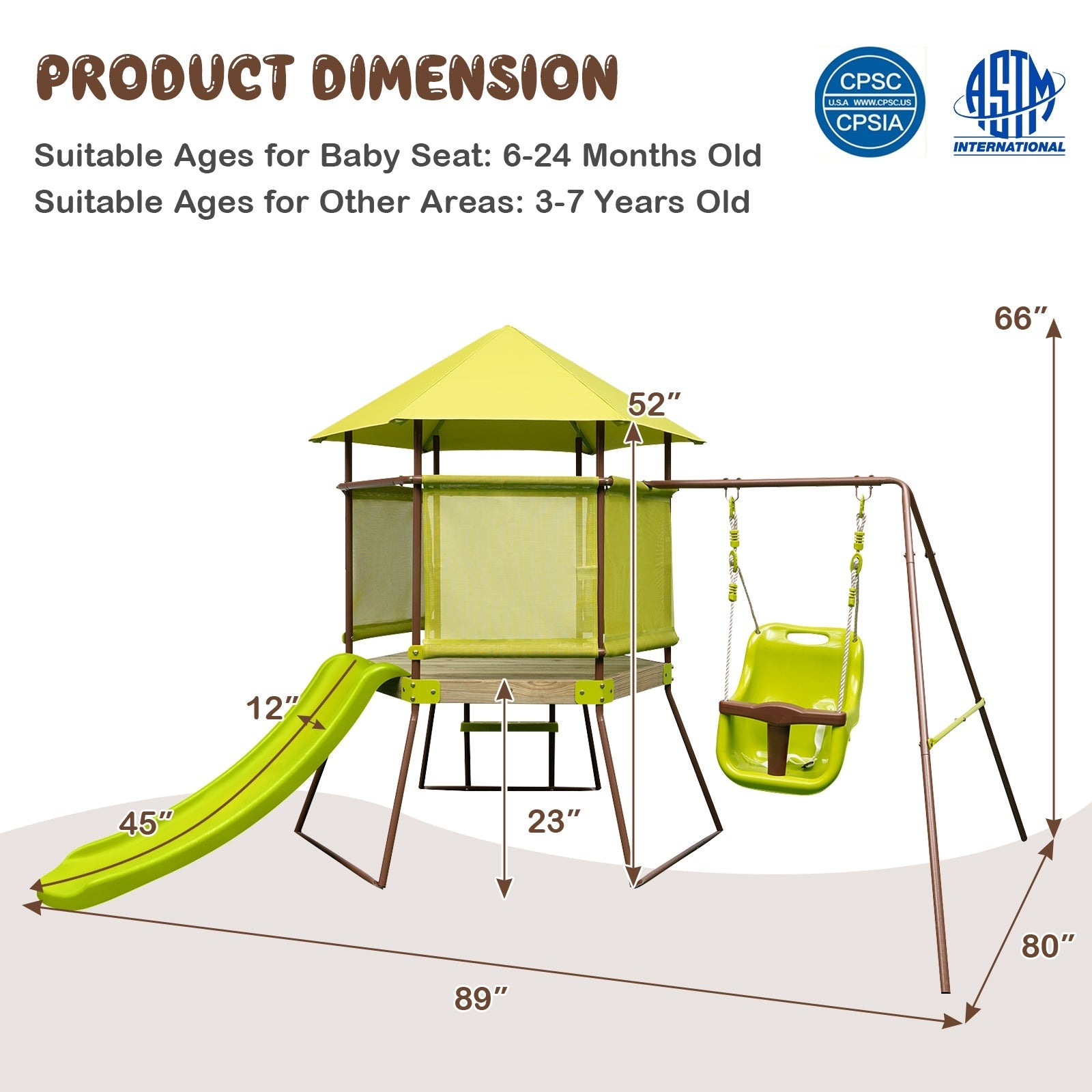 - Color Green Materials Metal, HDPE, Cedar Wood, Polyester, Fabric Product Dimension 7.5 x 6.7 x 5.5 ft Size of Slide 46" x 12" Adjustable Range of Baby Seat 8"-10.5" Height from Ground to Platform 23" Height from Ground to Canopy 52" Net Weight 73 lbs Max Weight Capacity 200 lbs Suitable Ages for Baby Seat 6-24 Months Old Suitable Ages for Other Areas 3-7 Years Old
