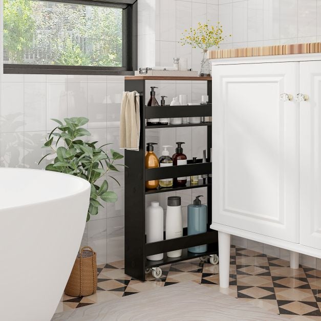 This versatile 4-tier cart provides reasonable storage partition for organizing various items. Whether you need to store kitchen supplies, office supplies, crafts, or other items, this cart is up to the task. Its compact and space-saving design helps maximize storage in any area, keeping your space neat and clutter-free. There are more user-friendly features, such as 4 smooth rolling casters and practical handle. Together with thickened board, the rolling storage cart is a reliable addition to your living space. Upgrade your kitchen storage and functionality with this rolling storage cart, and enjoy a clean, and organized room. Sliding Out Slim Storage Cart:Looking for a space saver? With the dimension of47 x 13 x 80 cm (L x W x H), this slim storage cart fits effortlessly into narrow gaps, optimizing storage opportunities in compact areas. Sorted Storage Space:The 4-tier utility cart provides ample storage capacity, allowing you to neatly store and categorize items including small seasoning jar, condiments and various drink bottles. More, the protective barson each shelf are effective to prevent items from falling. Easy Movement and Lockable Design:Equipped with 4 smooth rolling casters, 2 of which are lockable, the kitchen cart is easy to move anywhere and keeps stability in place. The side metal bar plays dual role as a portable handle to facilitate moving and as a handy towel rack. Built for Strength:Constructed with durable material, this rolling storage cart is built for lasting strength and boasts rugged structure. In addition, solid connection and exquisite craftsmanship will withstand years use. Practical and Versatile Use: Such apractical and stylish storage cart wisely combinesform and function. The utility cart canbe used as a storage organizer or mobile serving cart in the kitchen, laundry, or living room.