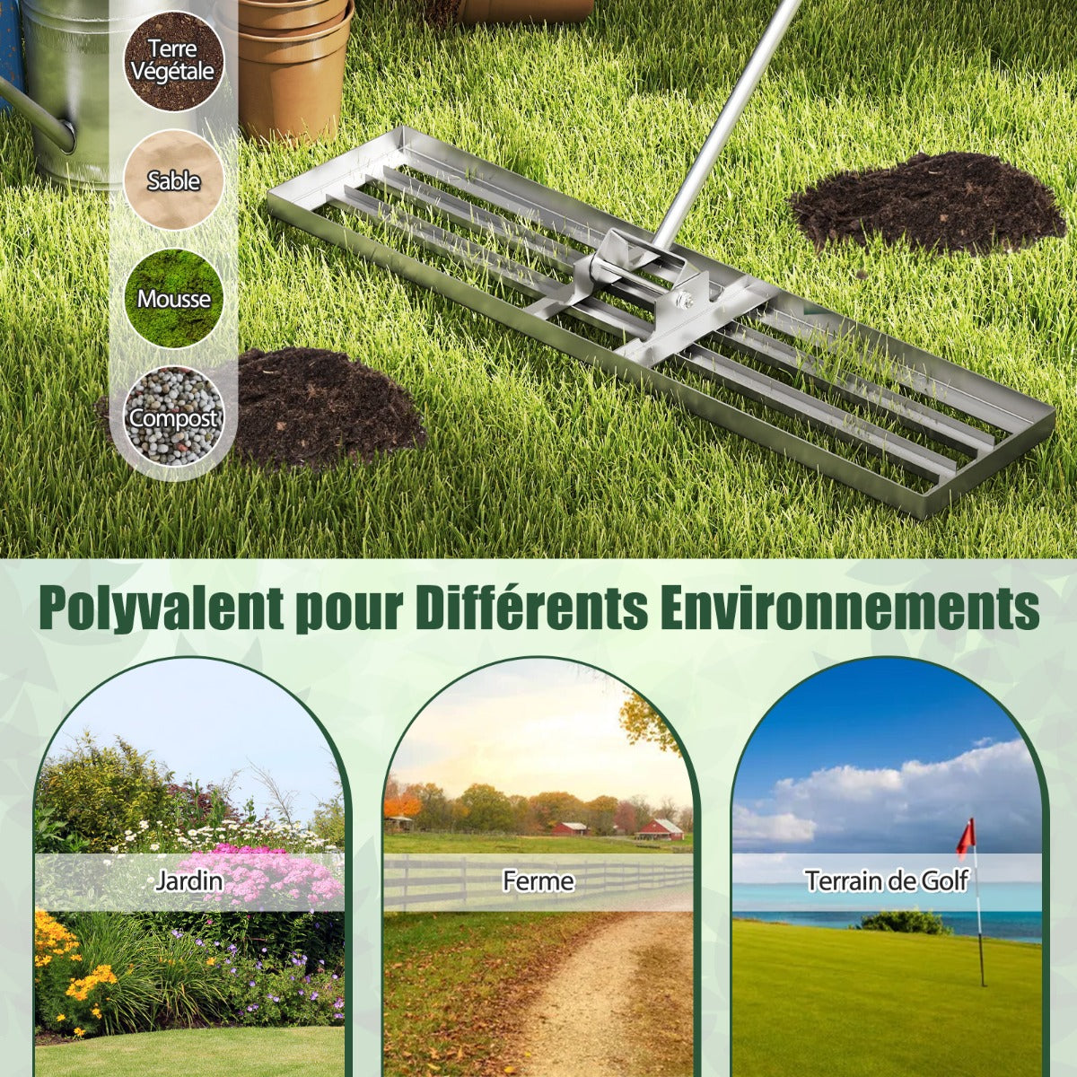 Color Black, Silver Material Metal, PVC Plate Dimension 42" x 10" Handle Length 67" Net Weight 13.5 lbs Box QTY 1(May vary by batch) Package Includes 1 x Lawn Leveling Rake,1 x Instruction