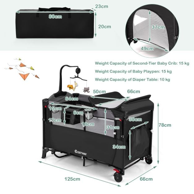 Technical data: Color: Black Material: Steel + Oxford Cloth + PP Overall dimensions: 65 x 125 x 78 cm (L x W x H) Second tier baby bed weight capacity: 10kg Baby Playpen Weight Capacity: 15kg Changing table load capacity: 10 kg Net weight: 10kg Scope of delivery: 1 x Baby Bed 1 x Carry Bag 1 x User Manual