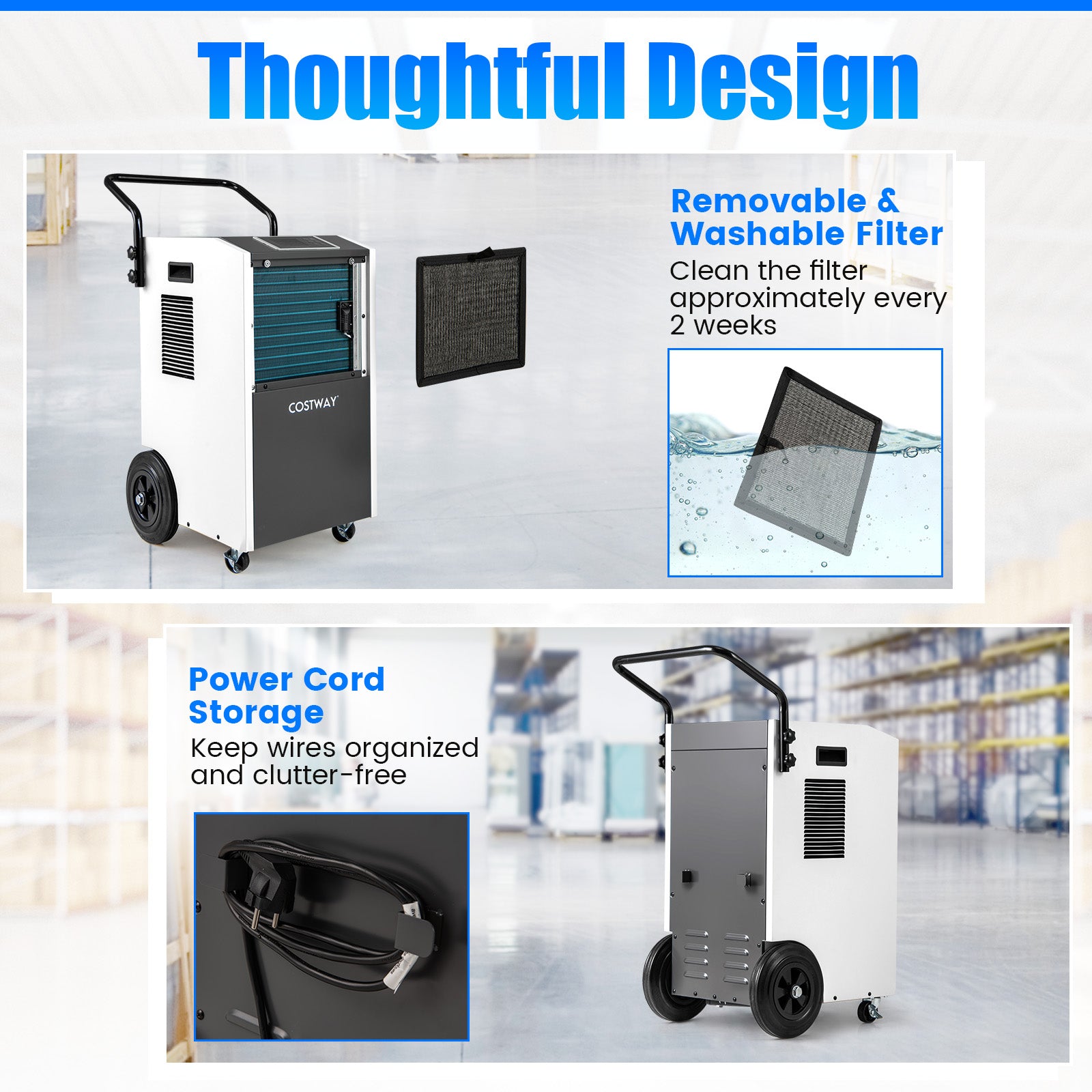 This 73 l/day commercial dehumidifier with drain hose and timer-white is designed to keep your space organised while delivering reliable everyday functionality and a clean, modern look.