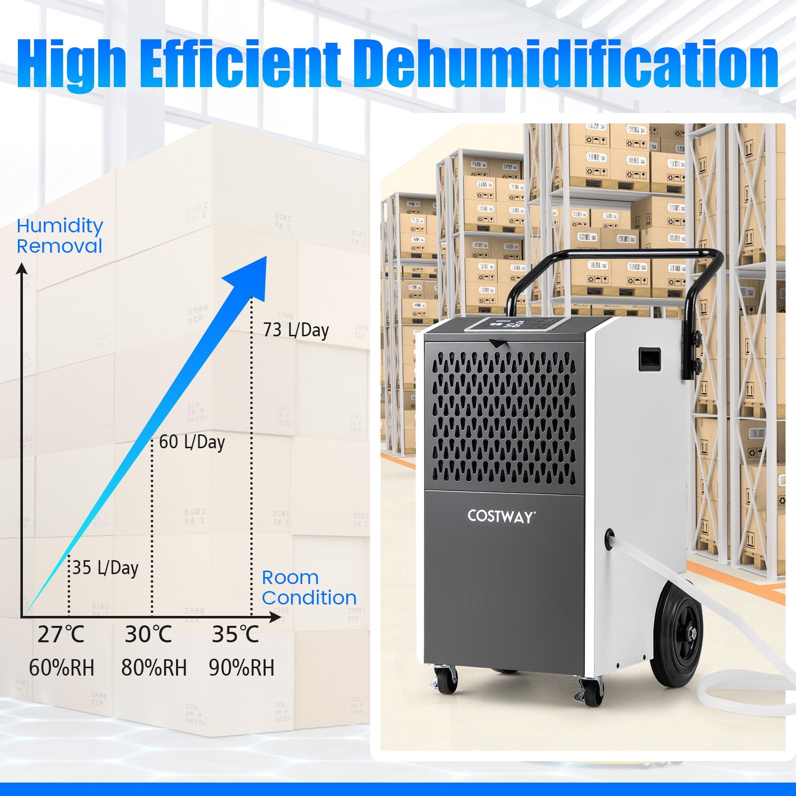 - 1 × 73 L/Day Commercial Dehumidifier with Drain Hose and Timer-White