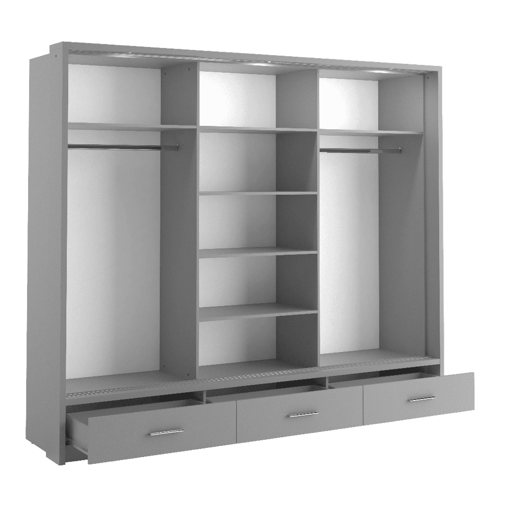 Make a bold statement with the spacious Arti 3-Door Wardrobe complete with mirrored sliding doors, LED lighting, drawers, and flexible storage zones.