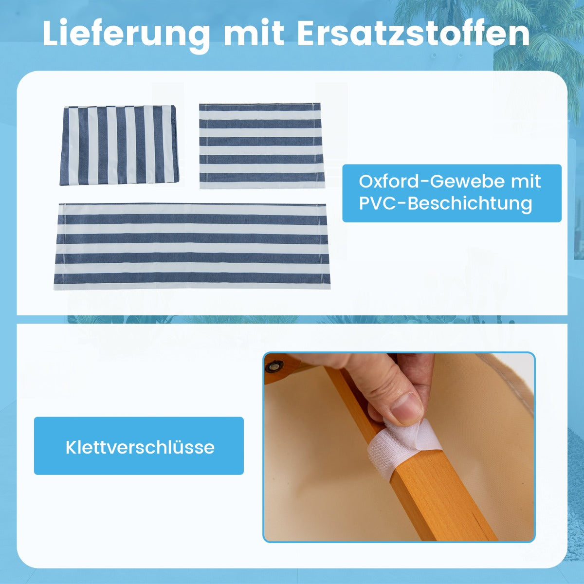 Colour: Beige + Natural Color of Replacements: Blue and White Stripes Materials: Birch Wood, Oxford Fabric Product Dimensions: 170 x 62 x 123-140 cm (L x W x H) Size of Canopy: 60 x 43 cm (L x W) Size of Seat: 143 x 44 cm (L x W) Size of Footrest: 68 x 48 cm (L x W) Adjustable Backrest Height: 75/81/87/93 cm Adjustable Armrest Height: 43/46/49/52 cm SeatHeight: 32 cm Net Weight: 8 kg Weight Capacity: 100 kg Package Includes: 1 x Folding Chaise Lounge Chair 1 x Canopy Replacement 1 x Seat Replacement 1 x Footrest Replacement 1 x Instruction