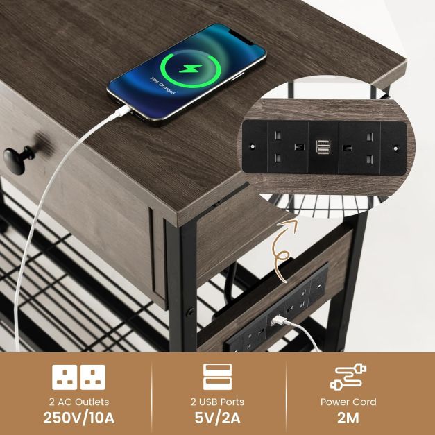 With its sleek design and ample storage space, this console table is perfect for showcasing your personal style and decluttering your living room. Two spacious drawers and metal mesh shelves allow for easy organization and access of your sundries and decorations. But that's not all - this side table is equipped with a built-in power strip for hassle-free device charging. Plus, the dual-sided power strip installation makes the charging station convenient to use. Worried about stability? Take it easy! The sofa table comes with two anti-tipping kits for secure anchoring to the wall. Crafted with a durable and rustic 18mm thickened tabletop, this table is built to last. Elevate your entryway experience - order yours now! Ample Space for Storage andDisplay: The entryway table provides you with 2 metal mesh shelves, a spacious top and2 drawers, making it hassle-free to organize the living room sundries and decorations. Say goodbye to mess and clutters! Convenient Charging Station: The console table with storage can further benefit daily use thanks to the built-in power strip, equipped with 2 AC outlets (125V/12A) and 2 USB ports (5V/2A). It is easy to charge your device now! Enhanced Stability with Anti-tipping Kits: The 81cmtall sofa table comes with 2 anti-tipping kits to further improve the overall stability. By anchoring the foyer table to the wall, you don't have to worry about it wobbling or tipping over. Details Matter: The coffee bar table features a 18mmthickened tabletop with beautiful wood grain for a long lifespan and a rustic appeal. What's more, it is fitted with 4 adjustable foot pads, making the table adapt to uneven floor. Easy andVersatile Assembly: With detailed instruction, it is easy for you to follow it step by step to install the entrance table. And with pre-drilled screw holes, you can install the power strip on both sides of the table.
