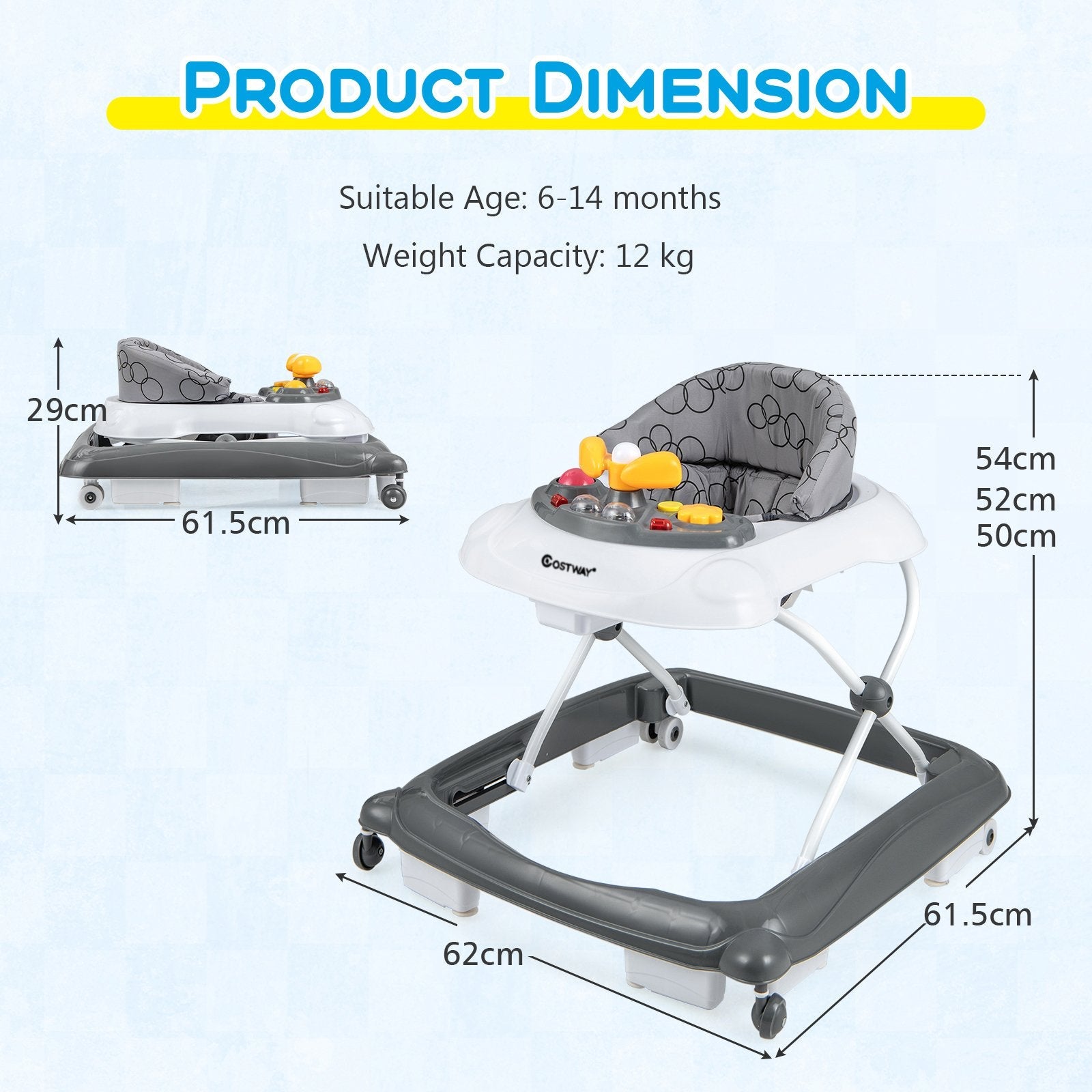 Foldable Baby Walker with 3 Adjustable Heights and Padded Seat-Grey