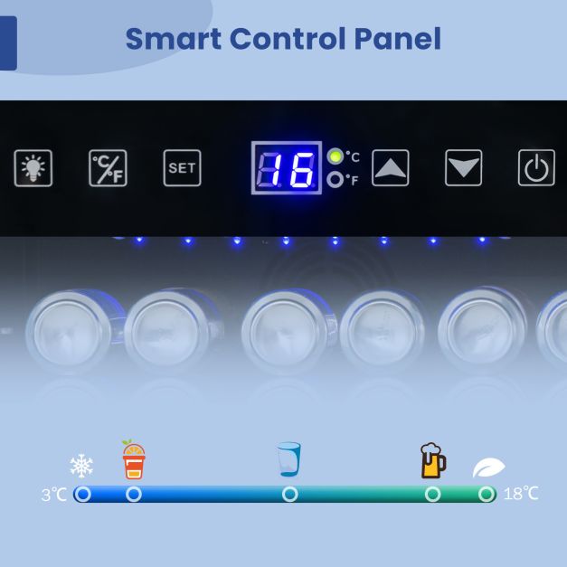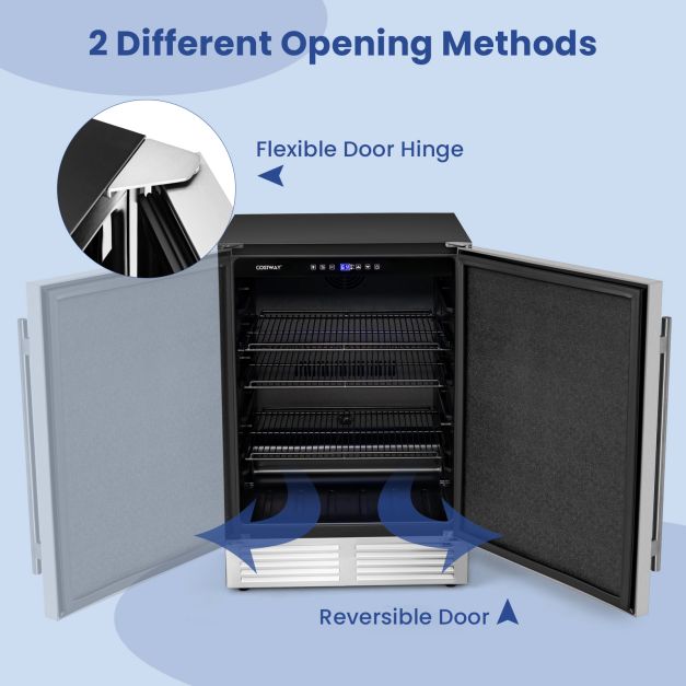 Decorate your room with the 24 inches large capacity beverage fridge! Equipped with 1 advanced compressor and 2 fans, this beverage cooler ensures efficient cooling. It’s also quiet and energy-saving. 3-layered foam door guarantees better insulation. Meanwhile, the beverage refrigerator with 3 metal shelves offers ample storage for up to 190 standard-sized cans of drinks. Moreover, smart control panel ensures easy operation, while built-in LED lights help to maintain visibility. Reversible door allows you to freely open it at the left or right side. Additionally, it can stand freely or fit perfectly under your counter. Strong Circulation Cooling System: The beverage cooler features a low noise compressor (37 dB) and 2 premium fans to achieve circulating cooling effects. It will quickly and evenly chill your sodas, water or beers. The auto defrost function works every 4 hours. Plus, it can also save energy during cooling. 4.9-Cuft Capacity for 190 Cans: This drink fridge has 3 removable andheight-adjustable shelves to place drinks. It accommodates up to 190 standard cans. You can adjust the wired shelves to put all your beverages in an upright or horizontal order, helping you make full use of its storage space. Reversible Door for Flexible Uses: The flexible door hinge helps to install the door in different ways to allow for left or right opening. Besides, the beverage refrigerator with adjustable feet can also be installed under the counter or placed on the floor. It’s ideal for kitchens, home bars or offices. Unique 3-Layered Foaming Door: The large foam door is designed with 3 layers: interior PVC, foam material and 304 stainless steel. Different from other glass doors, the foam door with 3-layered construction prevents condensation to ensure better insulation. Smart Control andHandy Handles: Smart control panel ensures easy temperature from 3℃ to 18℃, while the clear display shows the temperature. Bright LED lights help you to check your drinks. Thanks to the stainless-steel handle, the large beverage cooler is easy to open.