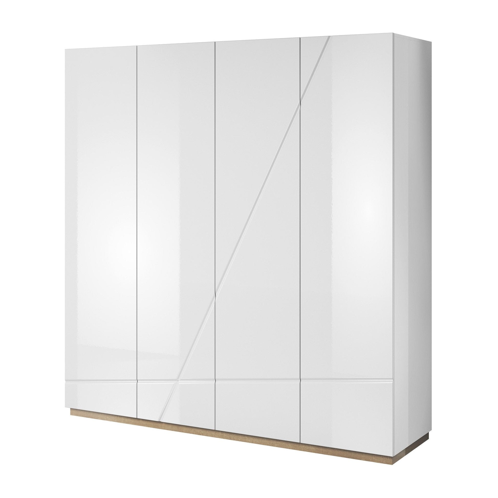 Maximise your bedroom storage with the Futura 4-Door Wardrobe crafted for function and flair. Behind its clean white gloss doors lies a divided interior: one side with four long shelves (three removable) and the other with a hanging rail and shelf, offering space for folded items and clothing alike. Its streamlined design is accented with subtle artistic lining, while the white matt and oak Riviera carcass adds warmth. A durable, stylish storage solution for contemporary UK interiors.