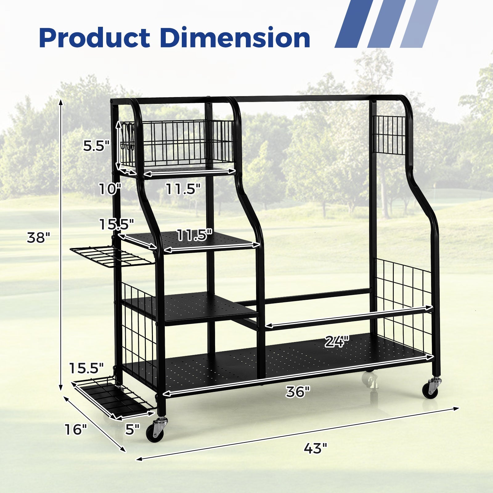 - Color Black Material Metal + PP Overall Dimension 43" x 16" x 38" Weight Capacity of Golf Bag Rack 88 lbs Weight Capacity of Each Shelf 11 lbs Net Weight 23.5 lbs