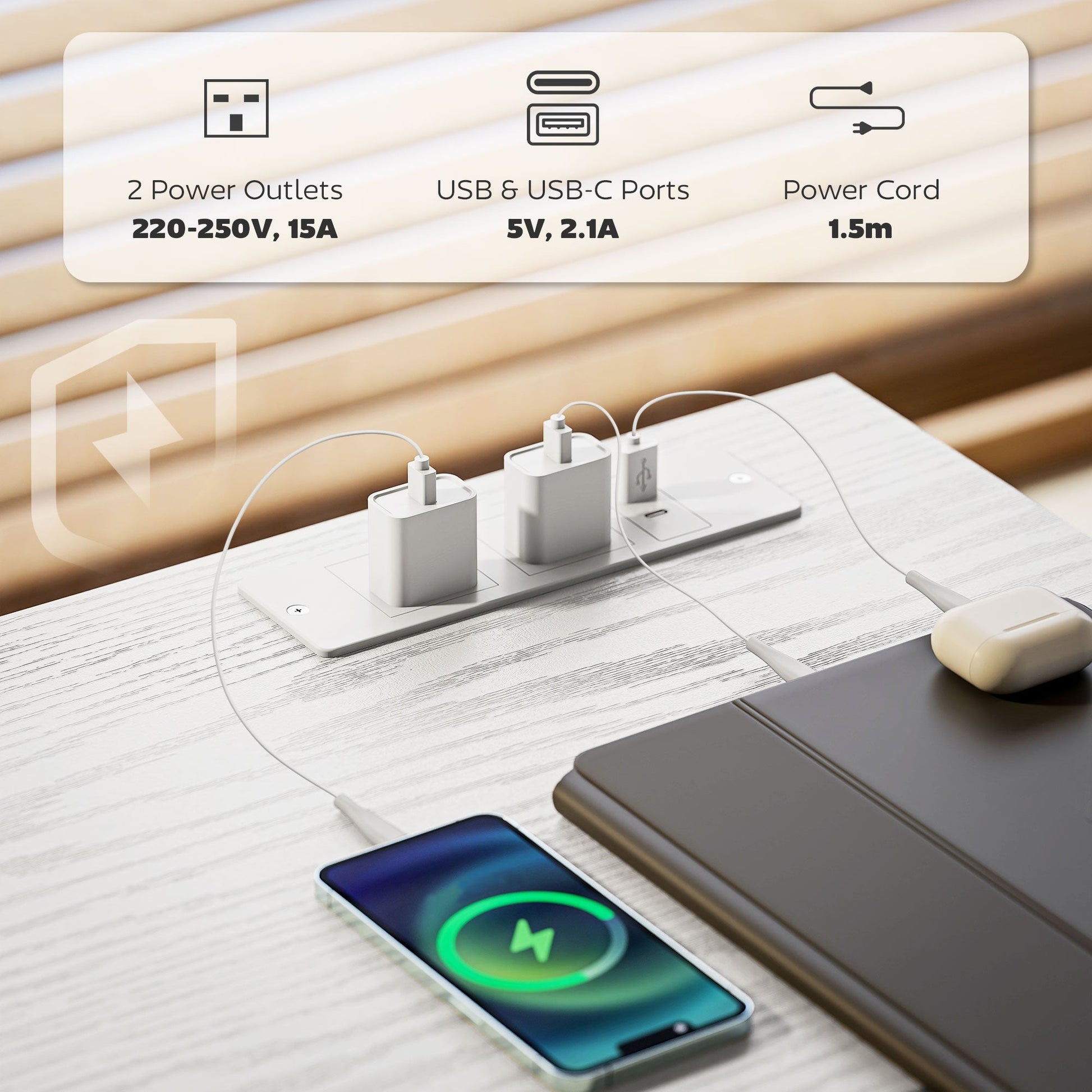 Tidy up your workspace with the HOMCOM computer desk, where convenience meets style! Stay charged and ready with the built-in charging station, equipped with two power outlets and two USB ports. Plus, this bedroom desk offers lots of storage with three fabric drawers and four versatile shelves, ensuring everything from books to stationery is neatly organised. Need extra space for your PC tower? Just remove a shelf! Transform and energise your work area effortlessly!