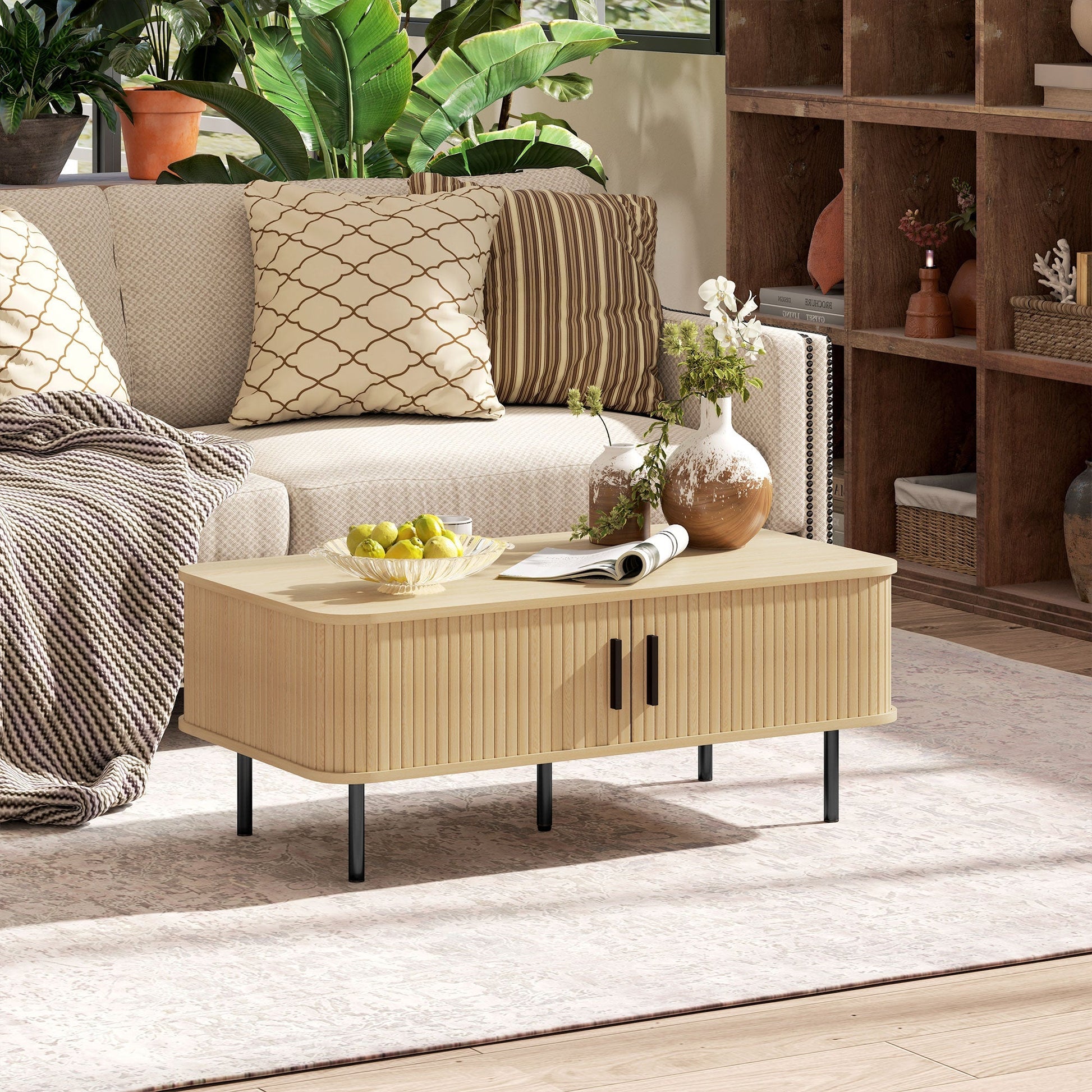 HOMCOM Coffee Table with Storage, Living Room Table with Slatted Tambour Sliding Doors and Foot Pads, Rectangular Coffee Table with Elevated Base for Living Room, Oak