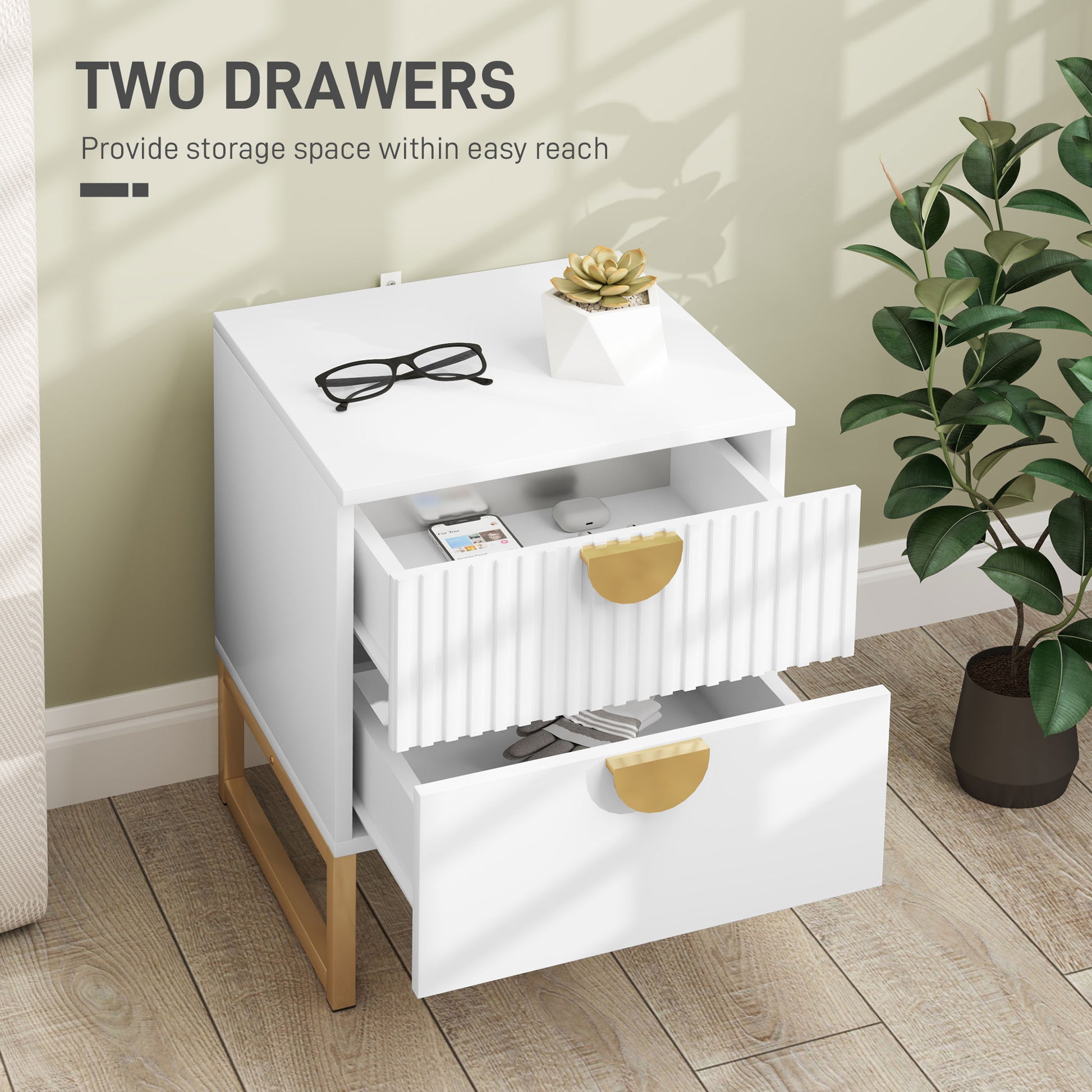 A bedroom essential, in bold and elegant style with this HOMCOM nightstand. The top ridged drawer front and gold coloured handles add a beautiful touch to the solid colour. With two drawers and a flat tabletop, there's lots of storage for bedtime essentials and more. Complete with a metal base for strong support.