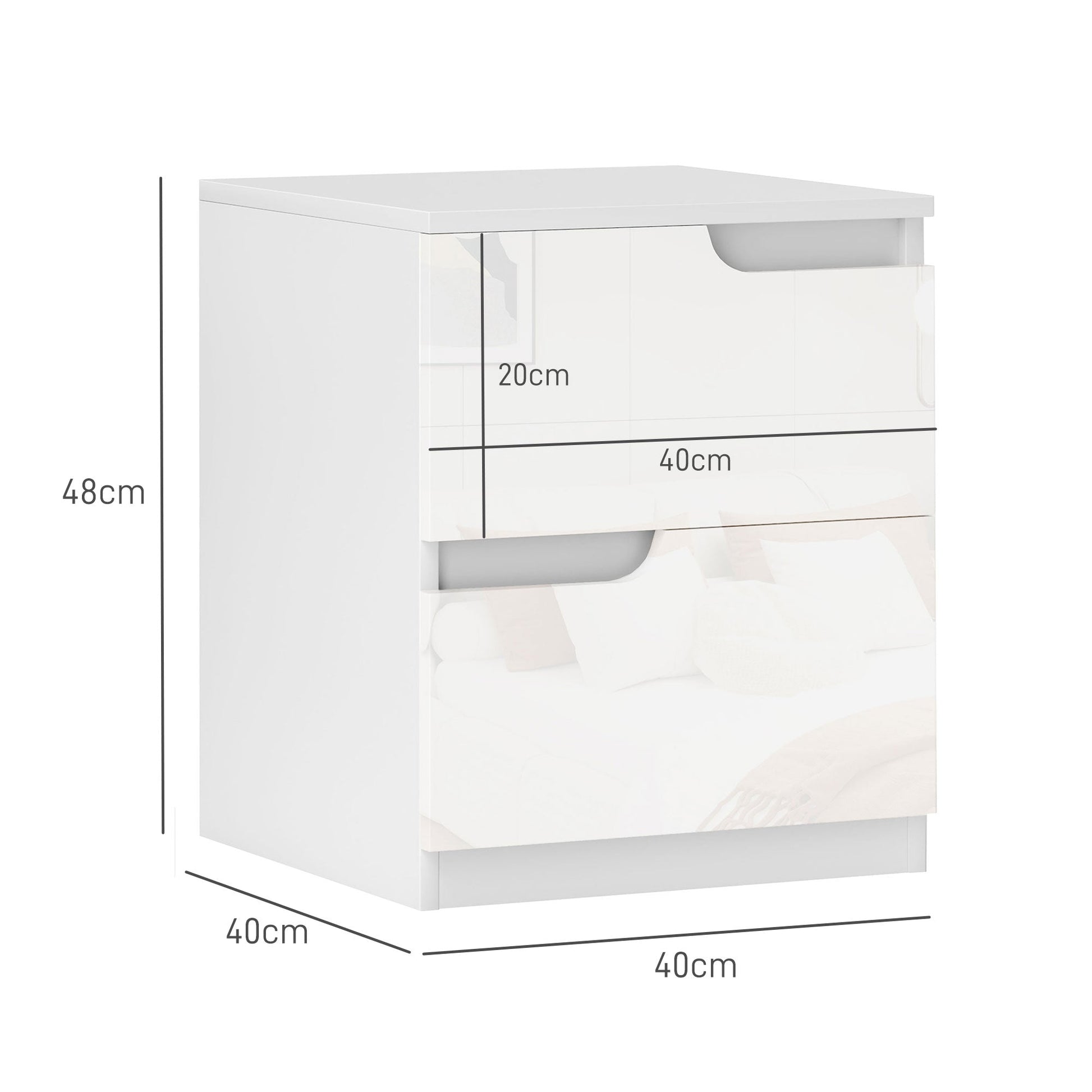 Your sleep bedtime companion - these HOMCOM nightstands. The white high-gloss finish, in a handle-less design makes it a sleek and modern addition to any room. The two drawers provide plenty of space for tucking away the essentials. Complete with foot pads to protect your floor from light damage.