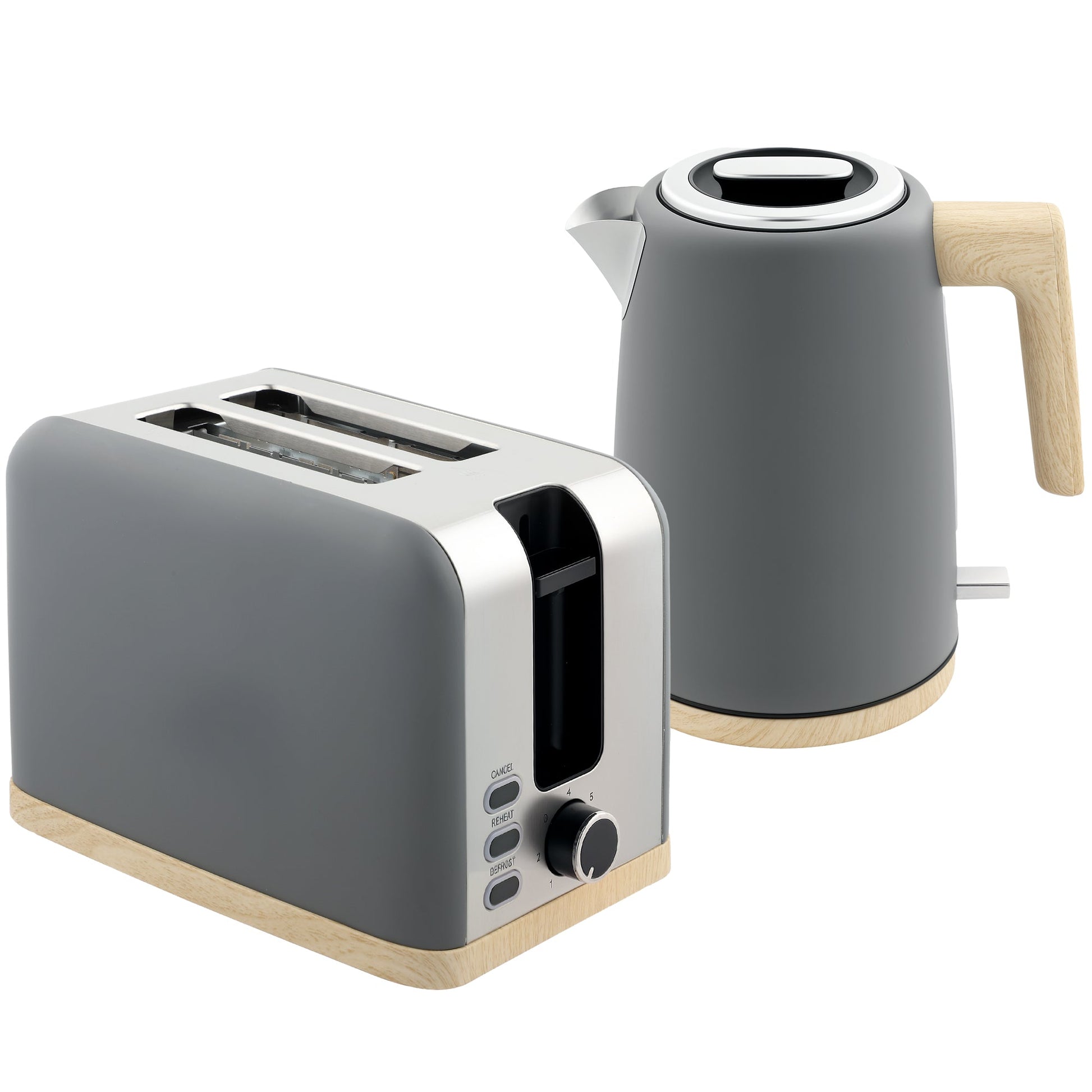 Elevate your kitchen's style with the HOMCOM grey kettle and toaster set. This chic, modern duo features a matte finish with wood effect, adding a touch of elegance. Toaster features chic, illuminated rings for modern appeal. The electric kettle boils a cup of water in just 42 seconds with its 3000W power, while the toaster offers seven-level browning control and special functions like reheat and defrost.