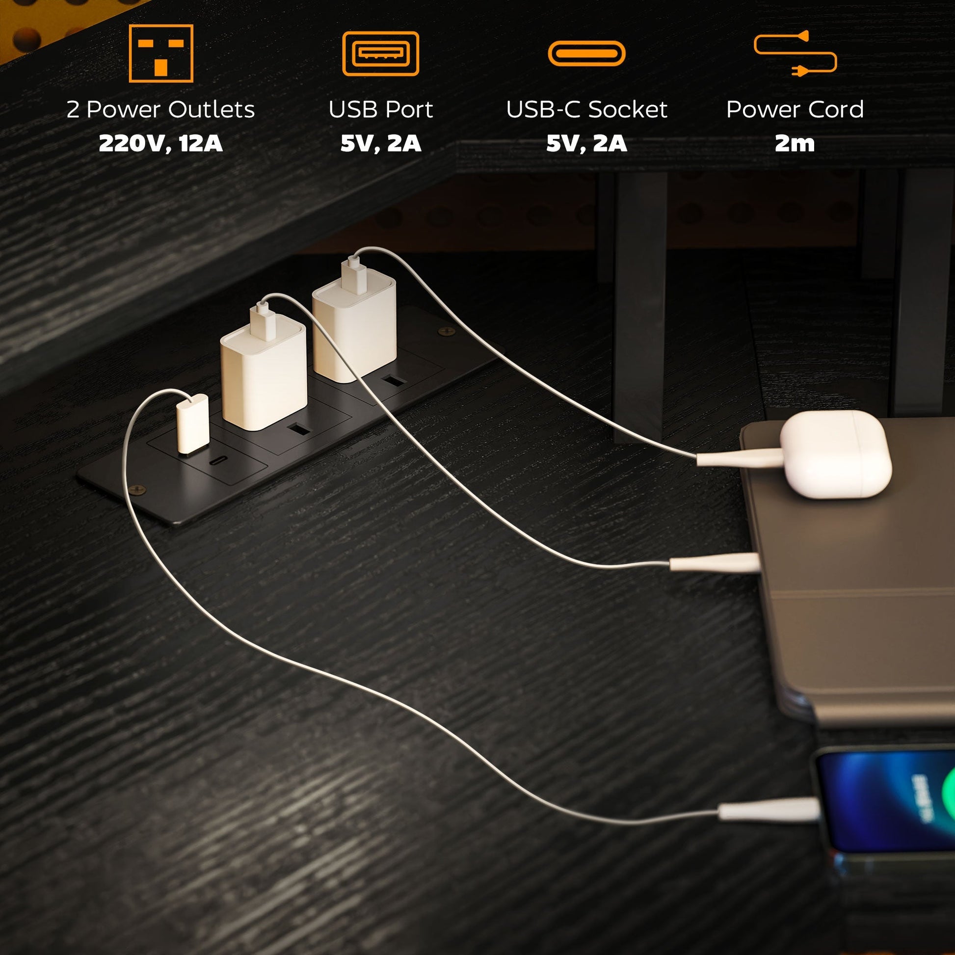 - Two power outlets, a USB port and a USB-C socket for easy, convenient charging