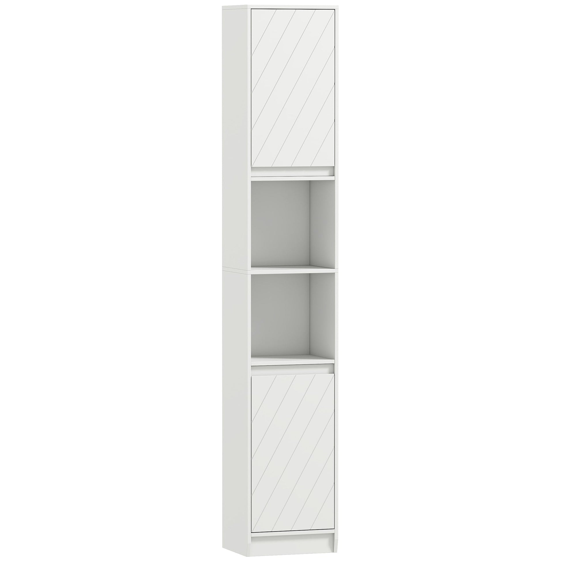Maximise space and reduce clutter with this retro-style slim bathroom storage cabinet from HOMCOM. Made from solid MDF and particle board, it fits easily into tight spaces and offers two cupboards and two open compartments for towels, toiletries and more. Includes anti-tipping straps for added safety.