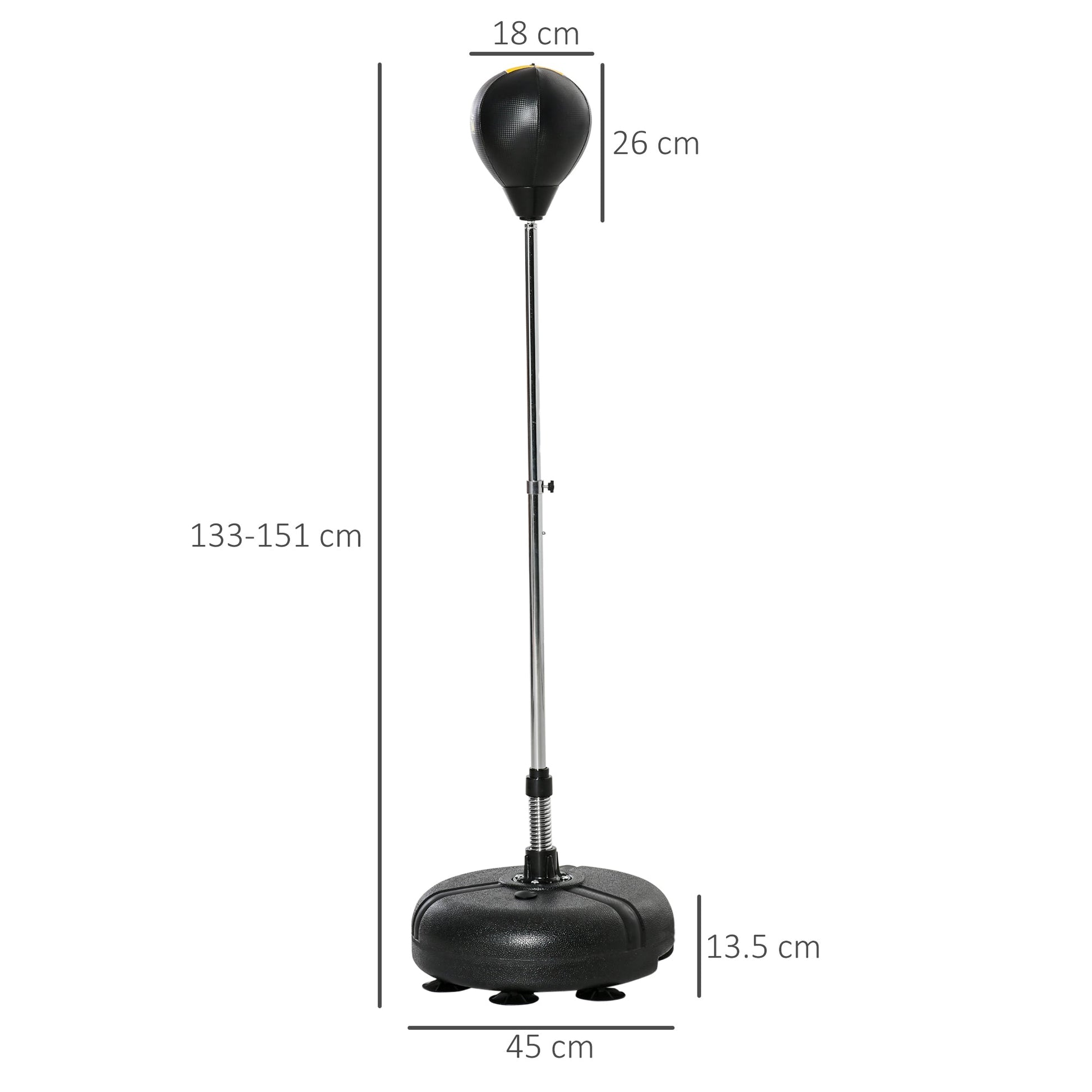Get into the fighting spirit with this HOMCOM standing punch bag. Release stress, improve hand-eye coordination and stay fit. The set includes everything you need: a punch bag, gloves and a pump. Adjust the pole between 133-151cm to suit different heights. The fillable base keeps it steady during use. The spring lets it bounce back into position for a full and intense workout.