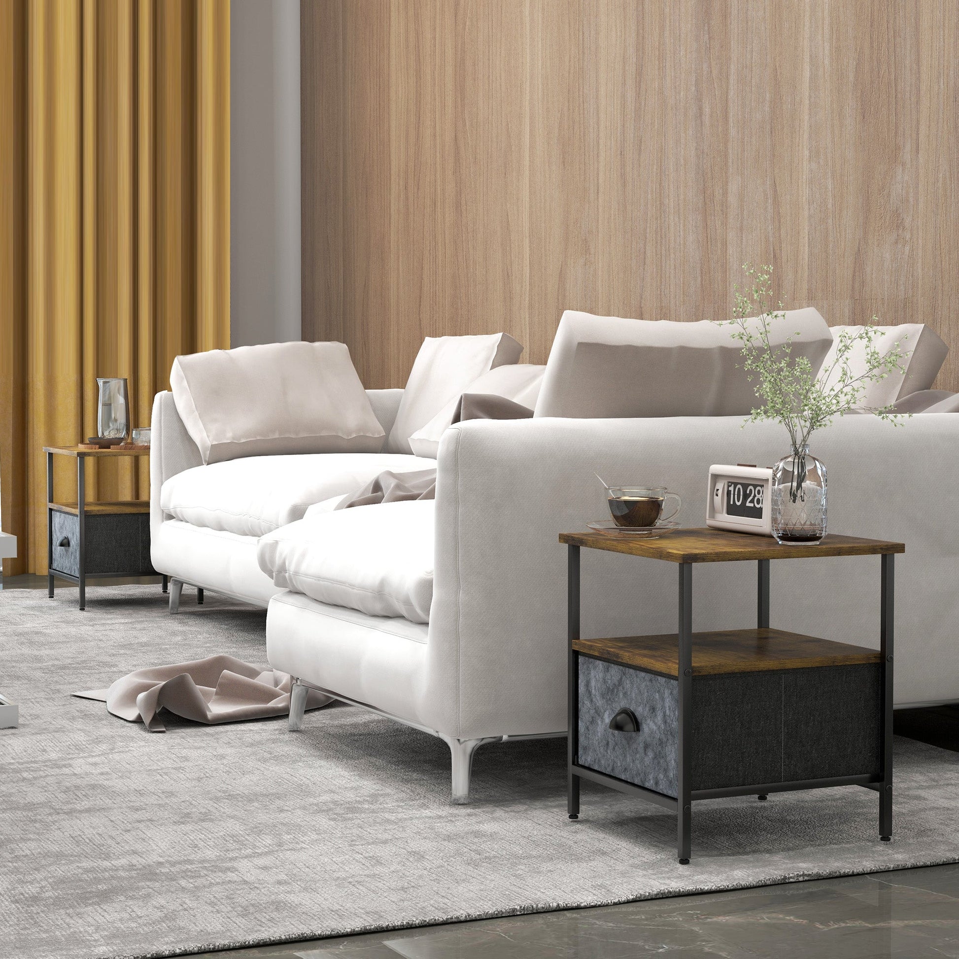 Industrial-style just stepped up: this set of 2 HOMCOM side table. A two-tone dark wood-effect design, paired with the matte black frame and grey drawer creates a striking and stand-out look, for a point of difference in the home. Comes with a bottom fabric drawers, an open shelf and a table top - plenty of handy storage space. The frame, made from metal, is robust, with adjustable feet to finish, so it always keeps balanced. Why not use as a bedside table?