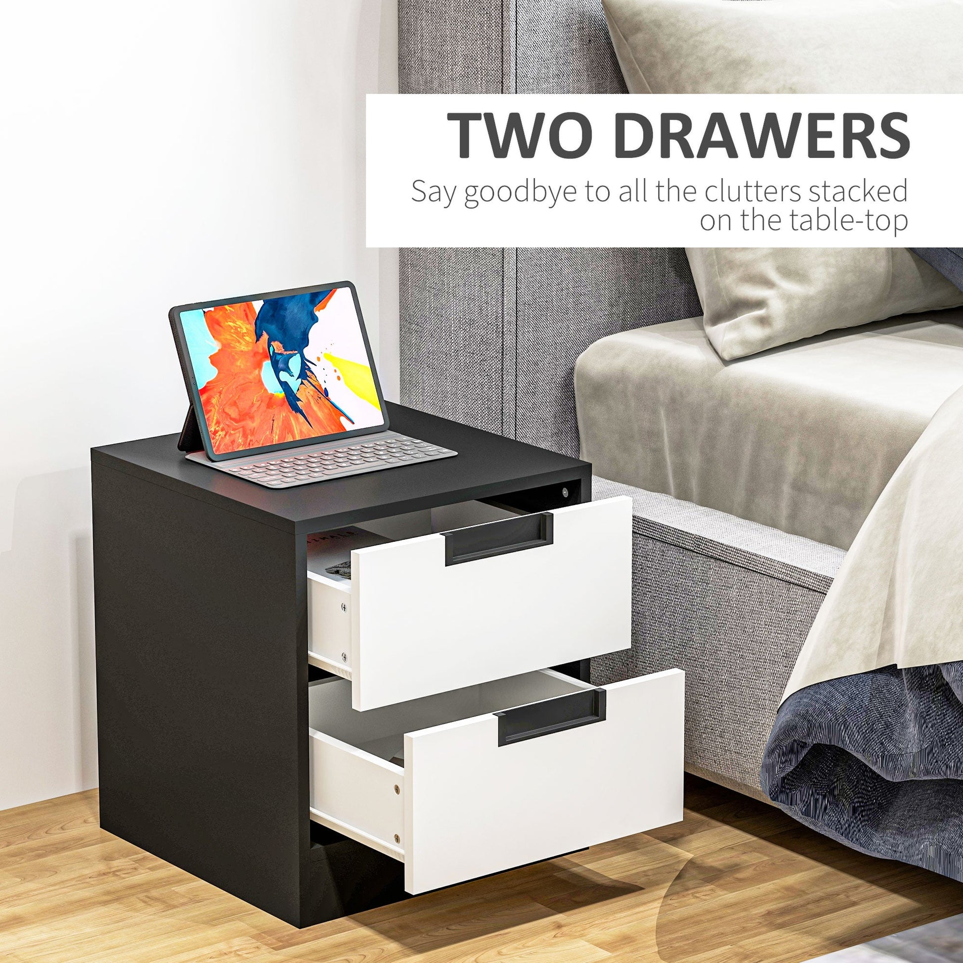 Extra storage, minimal style. These two HOMCOM bedside tables come in a monochrome design: a striking look, which is extremely versatile; looks great in plenty of home styles. Both tables feature two drawers: plenty of space for bedtime essentials, with cutout handles to open/close easily. Each end table is complete with anti-tipping straps for safety.