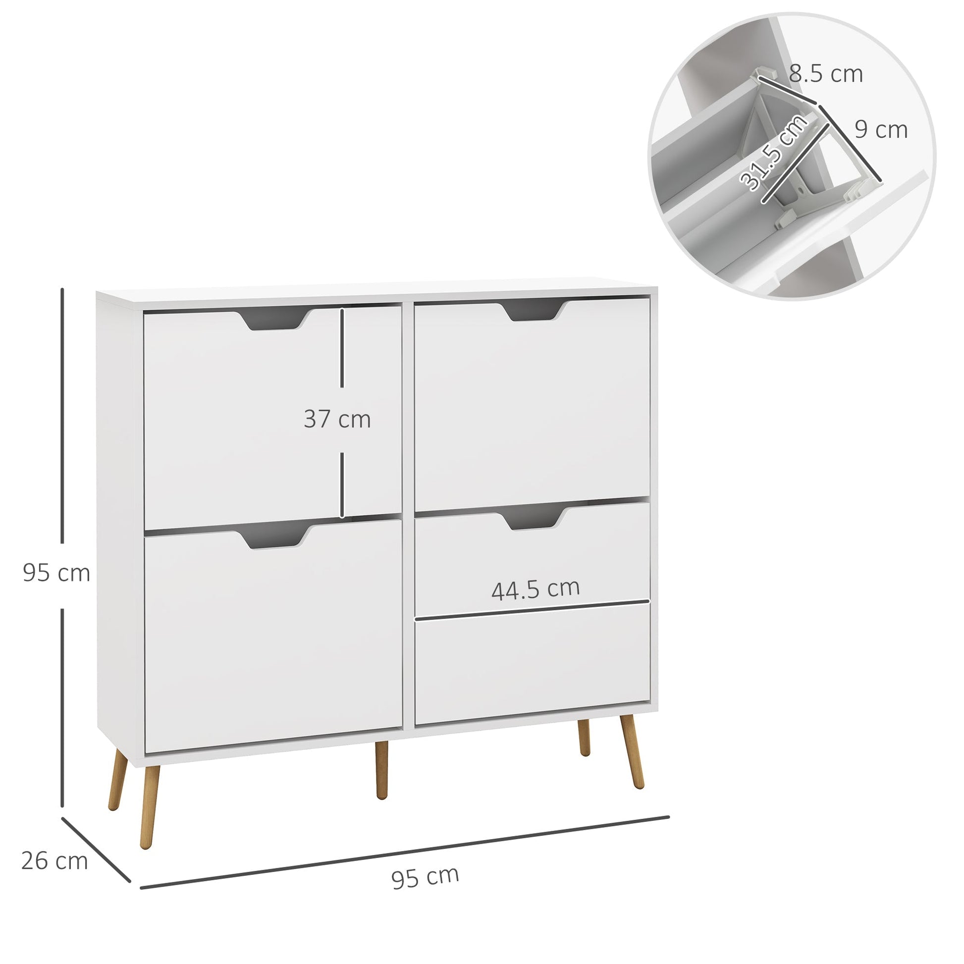 Make it modern with this HOMCOM shoe storage cabinet. A wood-effect frame and white door panels create a Scandi design, which is modern and fresh - as well as extremely versatile. Formed of four flip drawers, making it easy to access: each section holds four shoes up to a UK size 9.5; this shoe storage unit is ideal for shared household use. Comes with anti-tipping straps to attach to a wall; it won't fall forwards.