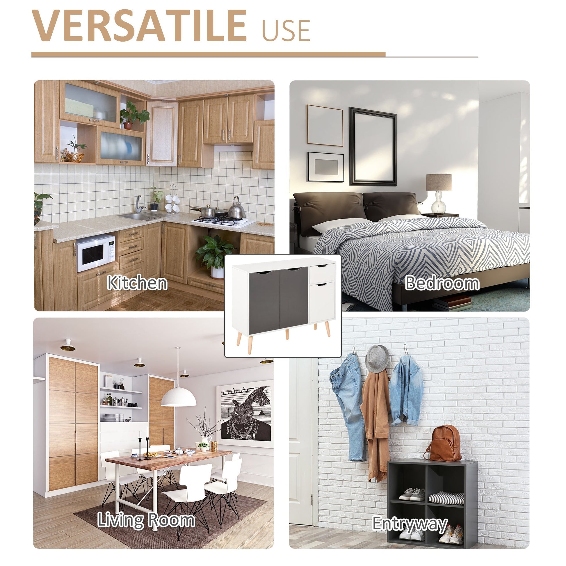 Keep your home stylish and the space tidy: look no further than this freestanding cabinet from HOMCOM. Cut to a clean boxy shape for simplicity, it comes with two large cupboards, a smaller cupboard and a top drawer, giving an abundance of handy storage. The white frame is clean, with the mix of white doors and coloured doors adding a unique point of difference so it stands out. Made from particle board, this piece is durable, finished with five wooden legs so it stands steady and back straps so it doesn't topple over.