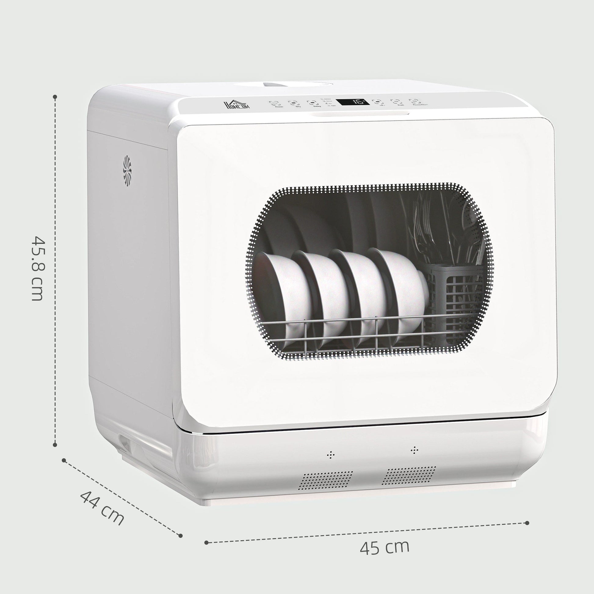 Say goodbye to the hassle of manual dishwashing, anywhere, with this HOMCOM tabletop dishwasher! It has six programmes: intensive, efficient, normal, rapid, fruit wash and drying. The efficient spray arm ensures sparkling clean dishes every time. A compact dishwasher, suitable for four-person households.