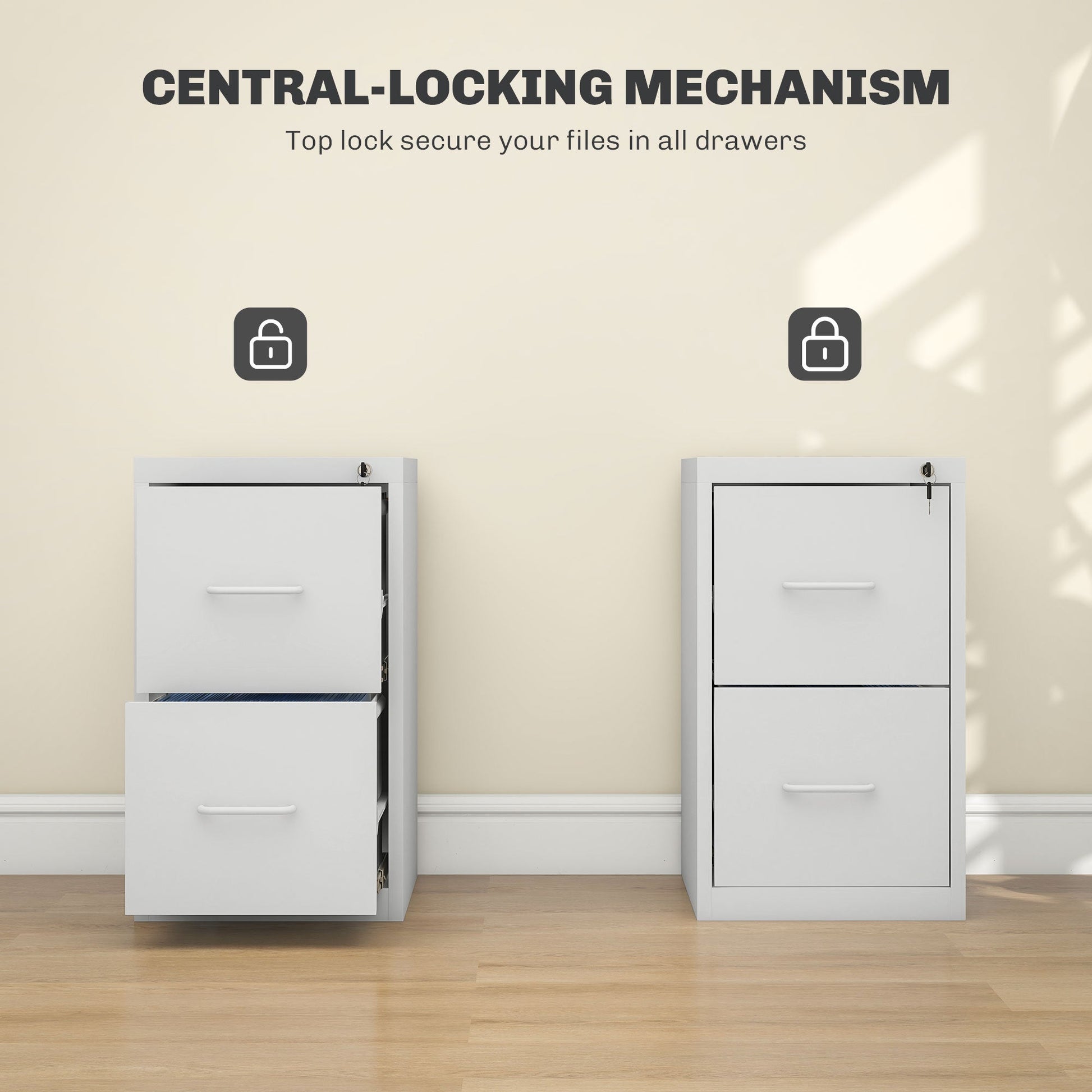 Keep your workspace tidy and organised with this HOMCOM filing cabinet. It features two drawers with adjustable bars for A4 and letter size files - plenty of room for keeping paperwork together. The top centre-locking system ensures locks all drawers simultaneously for security. Enjoy a clutter-free space with a modern touch.