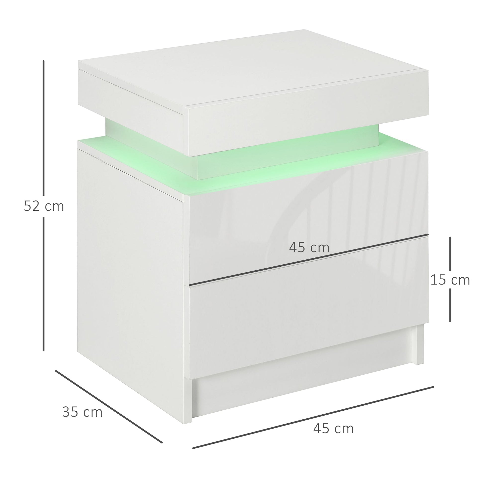 HOMCOM White Bedside Table with LED Light, High Gloss Front Nightstand with 2 Drawers, for Living Room, Bedroom