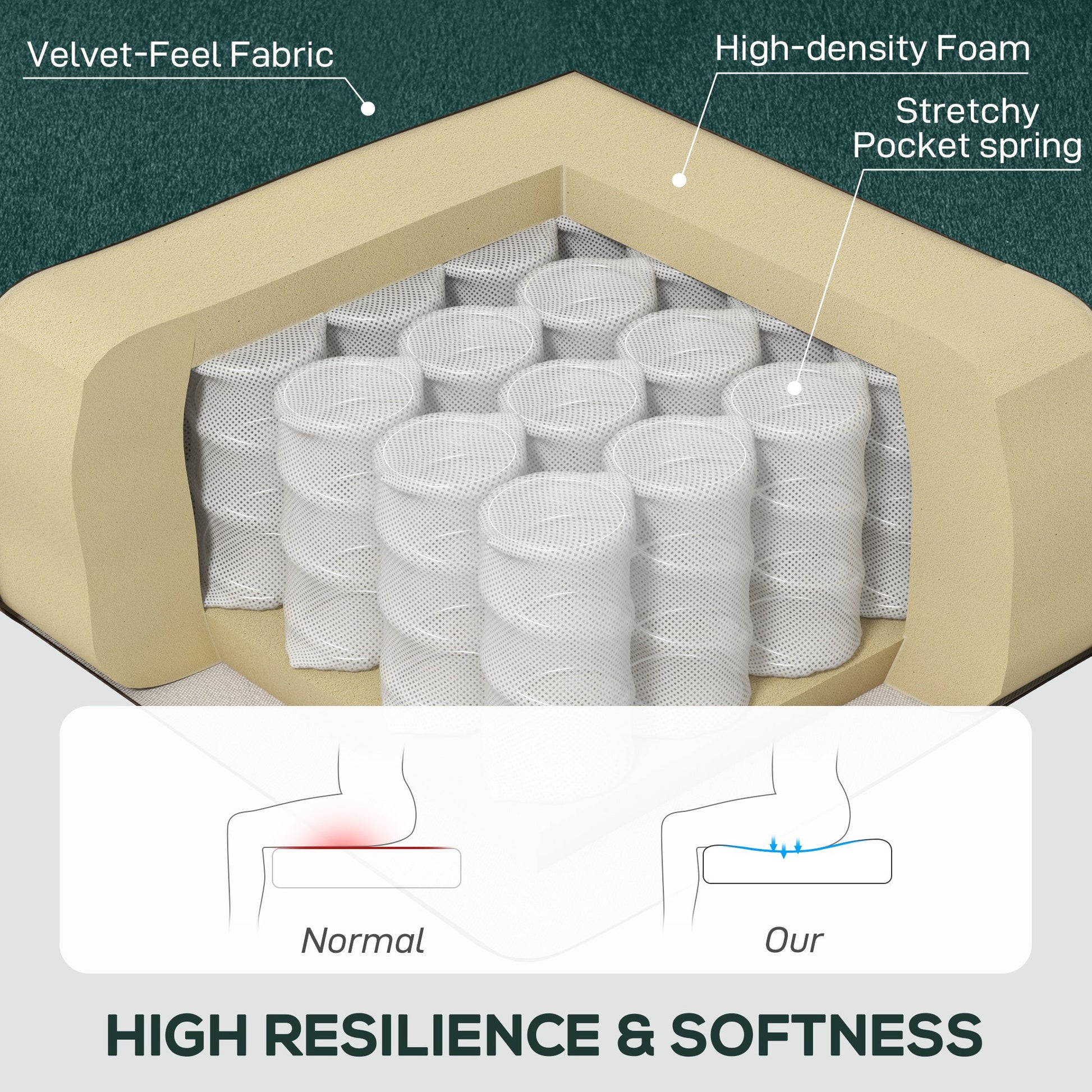 - Thick foam padding and pocket springs for comfort and support
