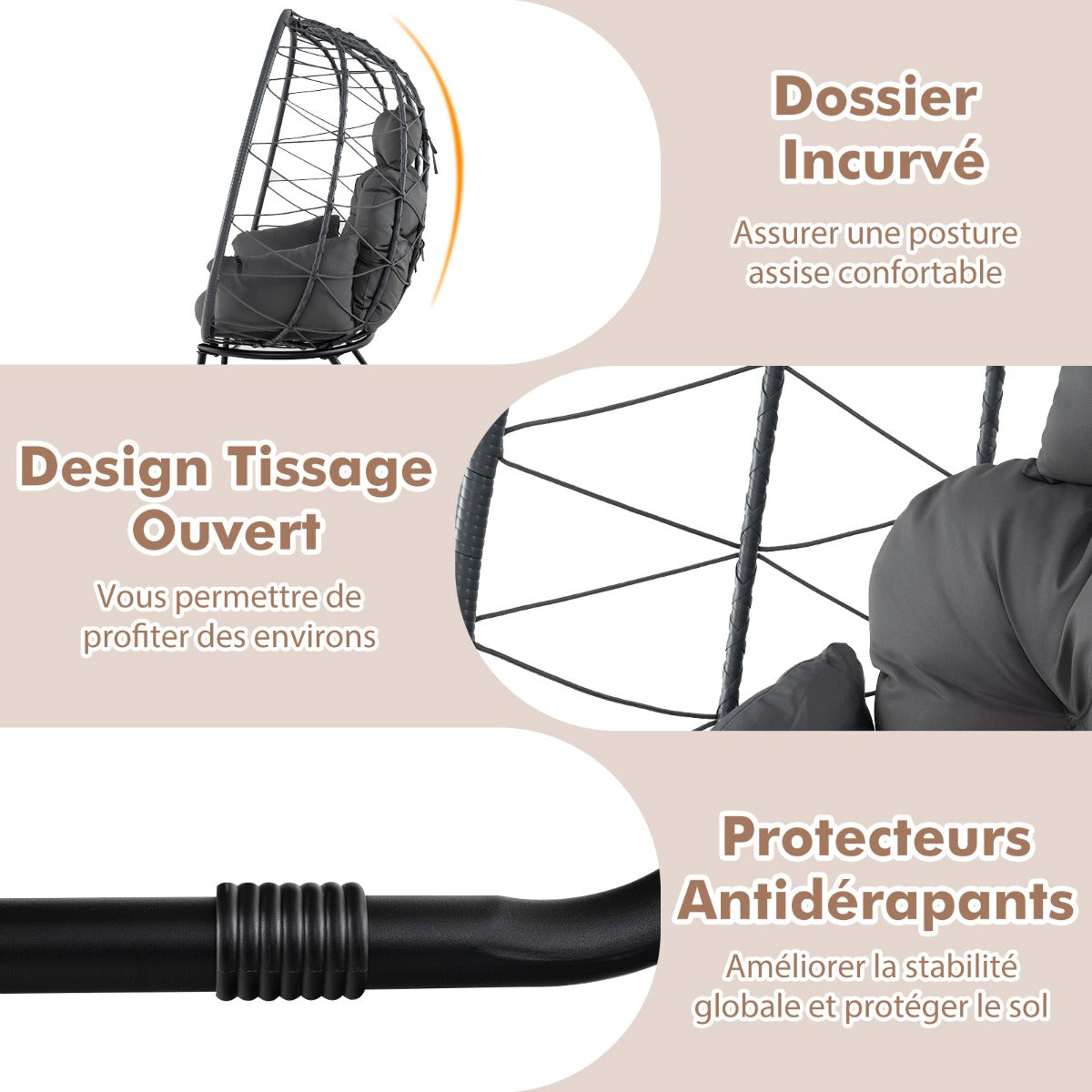 With high-density sponge cushions surrounding the eggshape, the outdoor loungerprovidesyou with exceptional support and comfort.Crafted with high-quality PE wicker, this egg loungerisresistant to wear and fading, ensuring long-lasting enjoyment. And the sturdy metal frame with non-slip pads brings stability and protection for your floors.The stylish stationary egg loungeris suitable for various occasions, transformingspace into your personal oasis. Ultimate Comfort:The egg chairis surrounded by cushions on 3 sides, which are filled with high-density sponge to offer soft and comfortable support. What’s more, the detachable headrest can be placed to support lumbar or neck, bringing customized relaxation. Premium PE Wicker: The well-woven rattan tightly wraps the patio basket chair, giving it excellent wear resistance, fade resistance and durability. In addition, theegg lounge chairis breathable and elegant, giving you an ideal resting spot. Sturdy Metal Frame: The high-quality metal comes with a plastic spray treatment, and is sturdy and resistant to the test of time. Besides, the porch lounge chairis equipped with non-slip pads to remain firmly in place and protect floors from scratches. Wide Application: The modern stationary egg lounger seamlessly integrates into living room, patio, garden, porch, etc,enhancing your indoor and outdoor spaces. Furthermore,it is a perfect nook for reading, lounging, or simply unwinding. Product Information: The overall sizes: 100 cm x 76 cm x 145 cm (L x W x H); the seat height: 44 cm; the weight capacity: 150 kg. The package contains well-illustrated manual to help you complete the assembly.