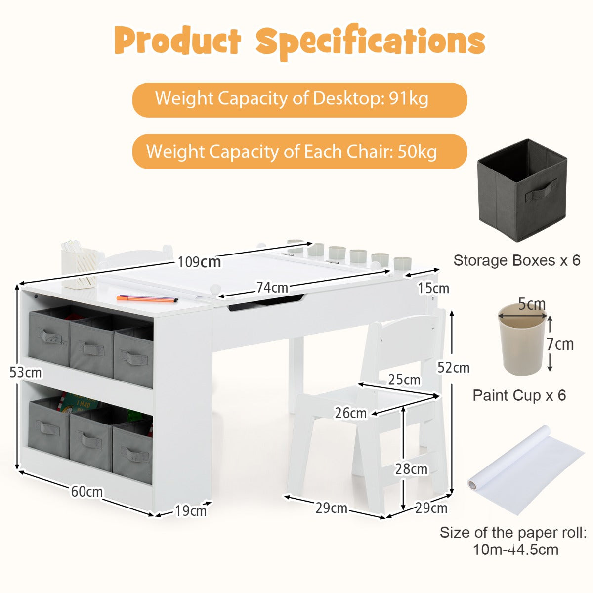 Colour: White Materials: MDF Dimension of Table: 109 x 61 x 53cm (L x W x H) Dimension of Chair: 29 x 29 x 53cm (L x W x H) Canvas Storage Basket Size: 15 x 18 x 18cm (L x W x H) Seat Height from the Ground: 28cm The Height from the bottom of the table to the floor:40.5 Maximum Width of Suitable Paper Roll: 44.5 Net Weight: 24 kg Weight Capacity of Tabletop: 100kg Weight Capacity of Chair: 50kg Recommended Ages: 3+ Year Old