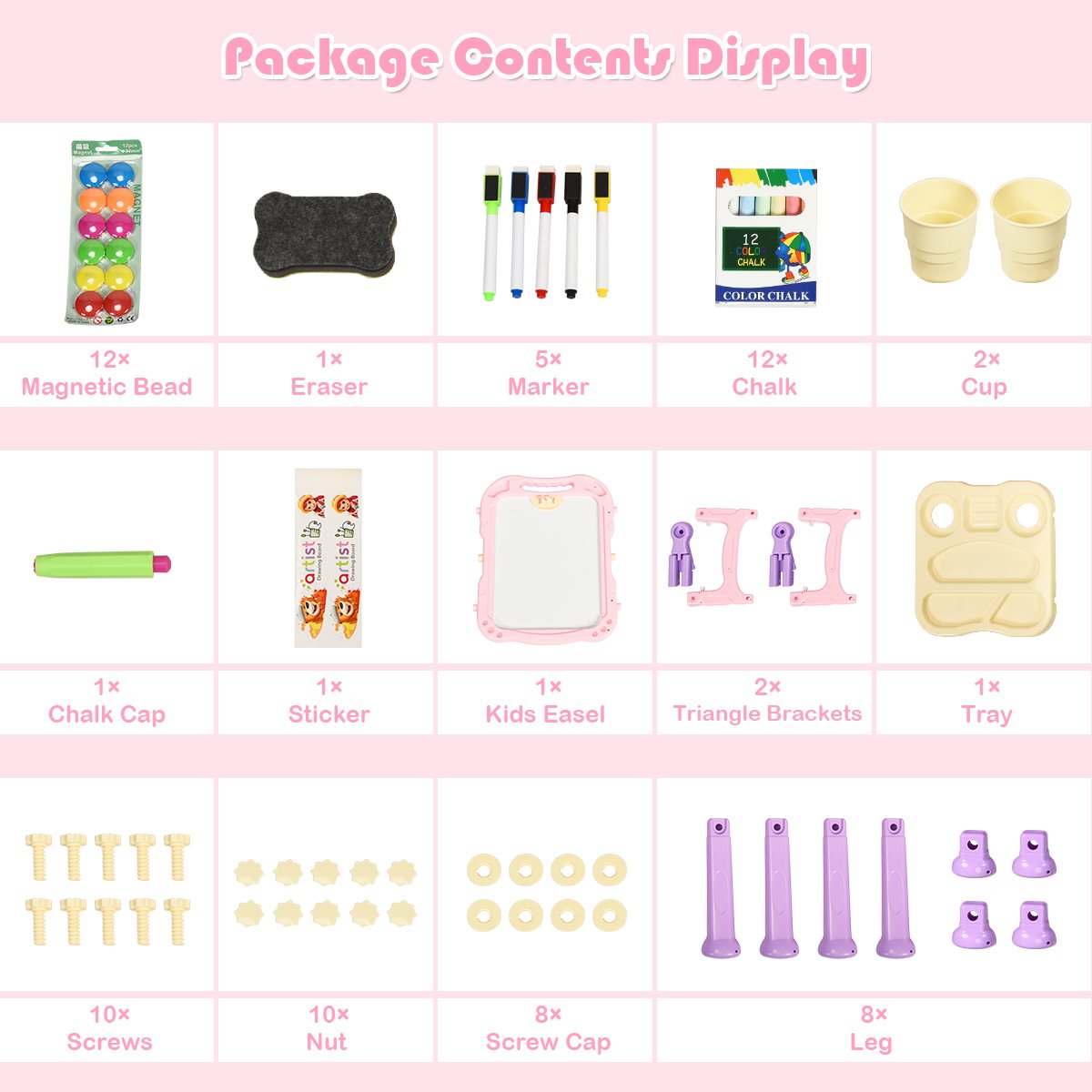 This art easel is a good gift for your little artist to release their talent for painting! Equipped with magnetic whiteboard and chalkboard, the young artist can draw with his/her best friend to promote friendship. 360° rotating design allows kids to switch freely and add more fun. Moreover, it is equipped with 2 lengths of legs, allowing you to customize the art easel according to your child's height. The storage tray is spacious to place chalks, markers, eraser, magnetic beads and so on. What's more, environmentally friendly PP material and stable triangle structure ensure good safety for kids to use. Detachable drawing board with handle allows kids to carry it and draw anywhere. Cute colours will attract little artists to stimulate their imagination and create more works. Do not hesitate to get it now! Easy to assemble and store Suitable for children over 3 years old Enhance interaction to paint with friends Improve a child's imagination and creativity Chalk cap to keep hands away from chalk dust Large storage tray to put art accessories in order 2 leg lengths for you to customize the proper height Environmentally friendly PP material for safe use Triangle construction to ensure excellent stability Detachable from frame to use as a handheld drawing board 360° rotatable adjustment and smooth track for easily switch Erase and magnetic beads can be attracted on the magnetic board Perfect for kids' art activities in classroom, preschool, playroom, etc Paper clip to clip drawing paper and chalk cap for multifunctional use Double-sided whiteboard and chalkboard to support separate painting Comes with an eraser, chalks, magnetic beads, markers, cups and chalk cap